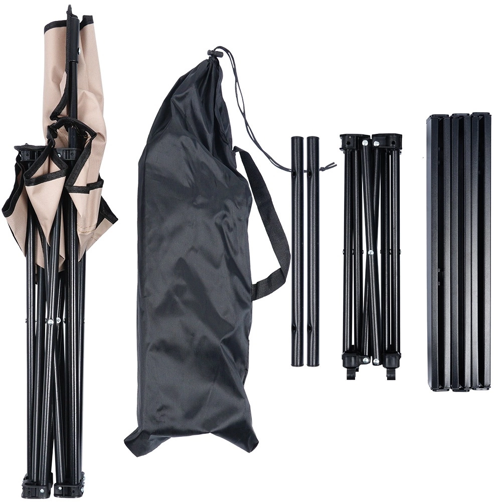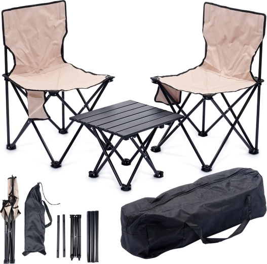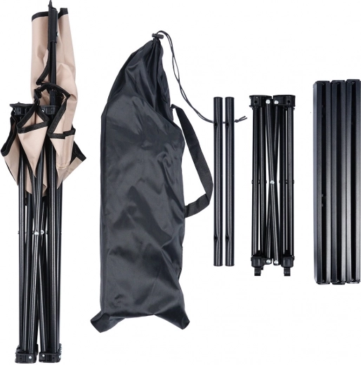 Nacisk na stabilność i trwałość zapewnia stalowa rama w czarnym kolorze oraz mocna tkanina poliestrowa w eleganckim beżowym odcieniu. Dzięki kompaktowym wymiarom zestaw jest idealny na kemping, piknik, wyprawy wędkarskie i relaks w ogrodzie.