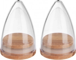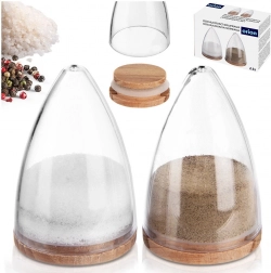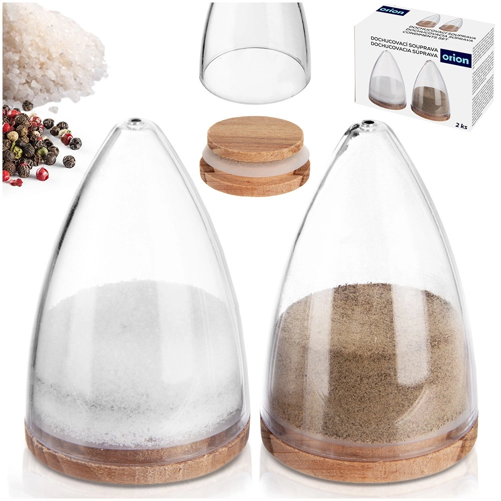 Zestaw zawiera dwa przyprawniki przeznaczone na sól i pieprz. Przezroczysty korpus umożliwia natychmiastową kontrolę ilości, a bukowa pokrywka z silikonową uszczelką zatrzymuje aromat wewnątrz i chroni zawartość przed wilgocią. Dzięki małemu otworowi dozującemu na szczycie wsypiesz dokładnie tyle, ile potrzebujesz – bez zbędnego rozsypywania.