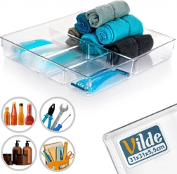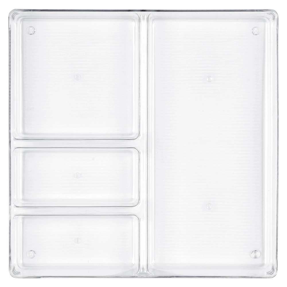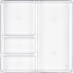 Praktyczny przezroczysty organizer do szuflady o wymiarach 31 × 31 × 5,5 cm oferuje cztery przegródki do przejrzystego sortowania drobiazgów. Jest wytrzymały, łatwy w czyszczeniu i uniwersalnie pasuje do kuchni, łazienki, biura oraz garderoby. Dzięki transparentnemu wykonaniu masz wszystko na widoku i pod ręką.