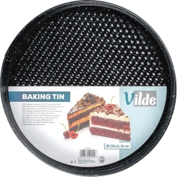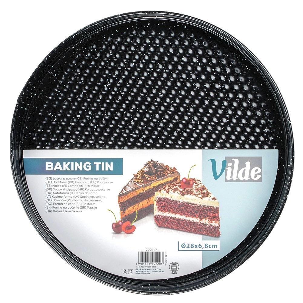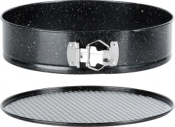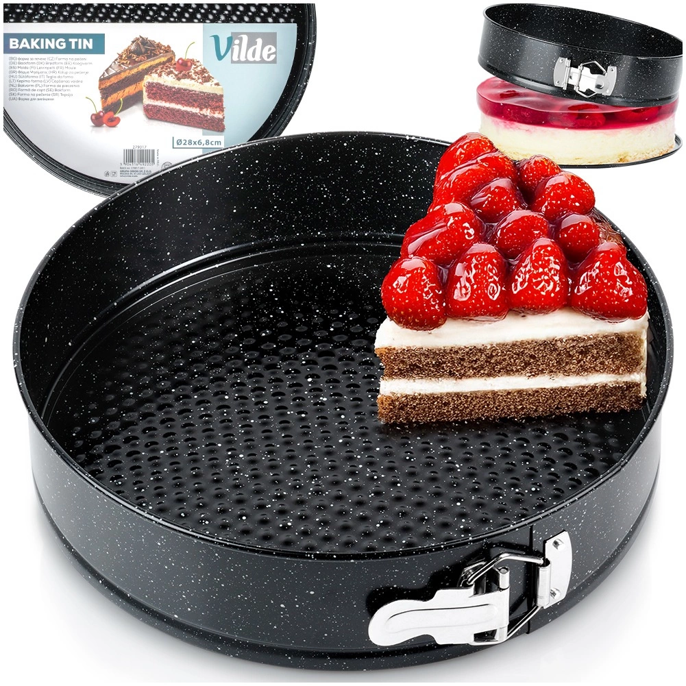Praktyczna okrągła tortownica o średnicy 28 cm z rozpinanym rantem i wyjmowanym dnem dla łatwego wyjmowania blatów. Wykonana z blachy stalowej (stali węglowej) z granitową powłoką nieprzywierającą, zapewnia równomierne pieczenie do 230 °C i łatwe czyszczenie. Idealna do tortów, serników, biszkoptów oraz dań zapiekanych.