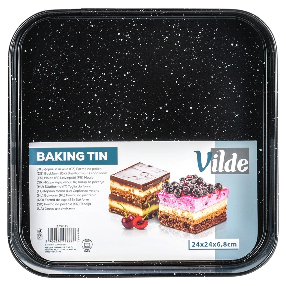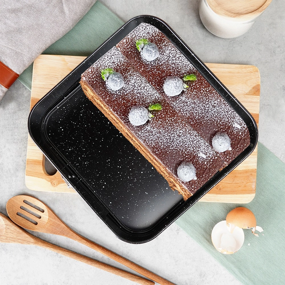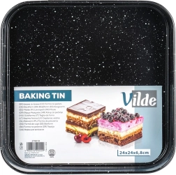 Solidna stal węglowa zapewnia równomierną dystrybucję ciepła, jest odporna na wysokie temperatury (do 230 °C) i nie pochłania zapachów ani płynów. Forma nadaje się do piekarników gazowych i elektrycznych, a dzięki kwadratowemu kształtowi świetnie sprawdzi się do ciast, blatów, serników oraz słonych zapiekanek.