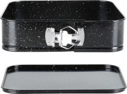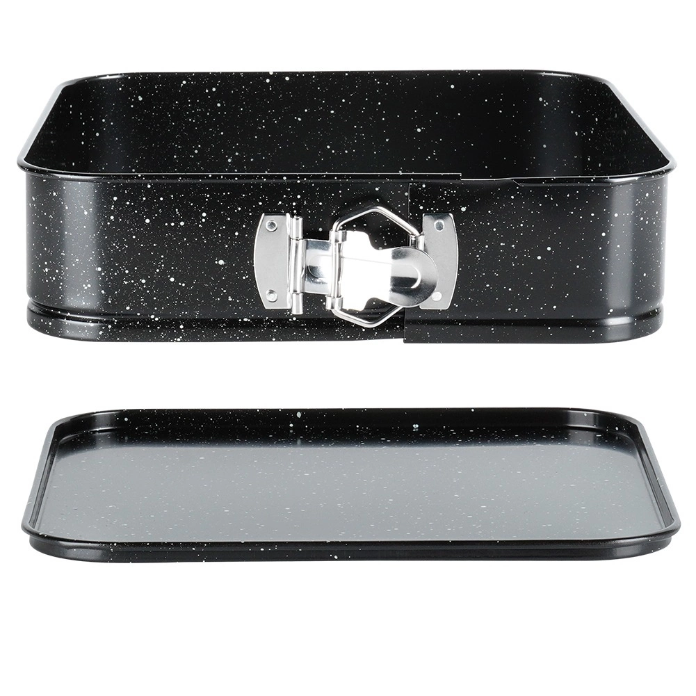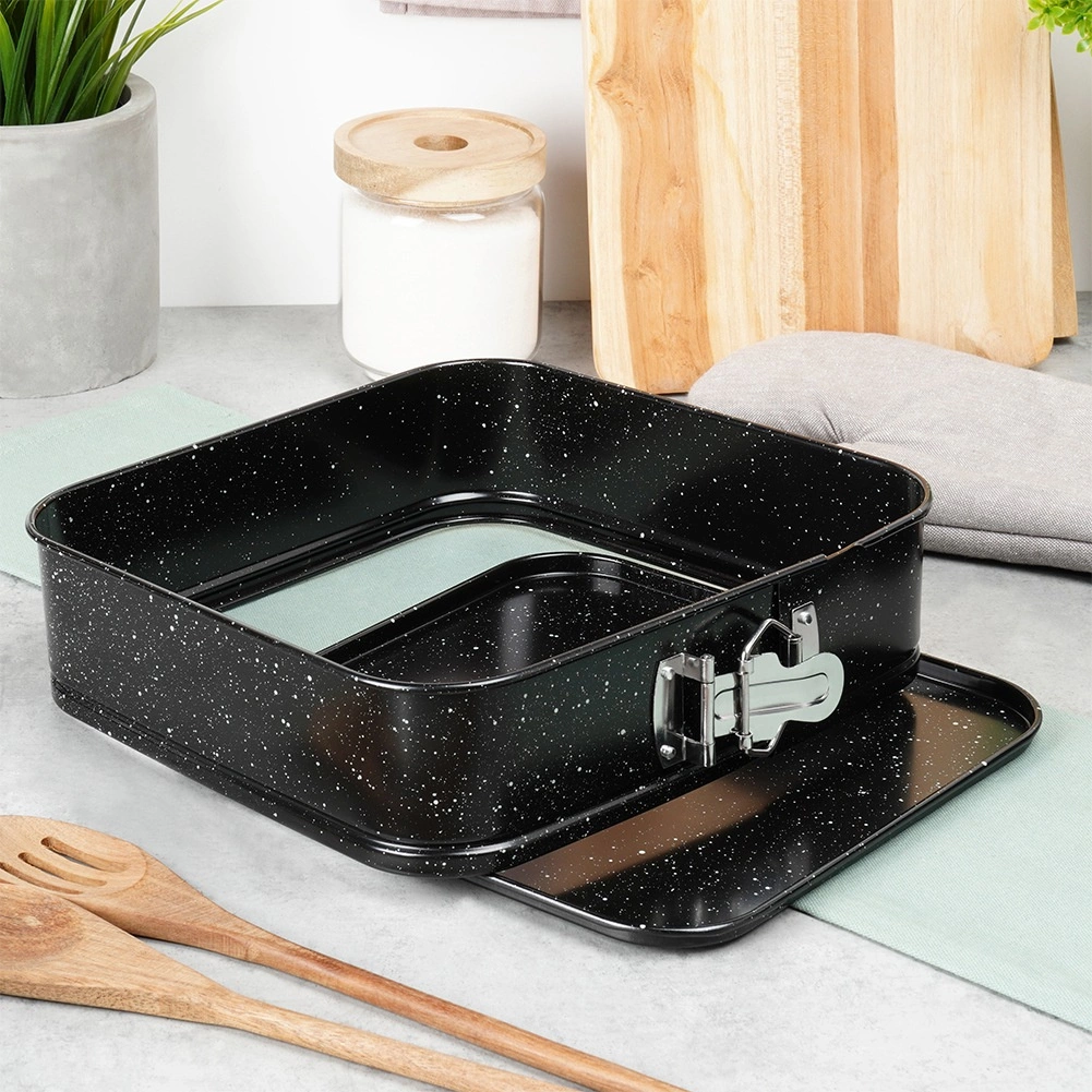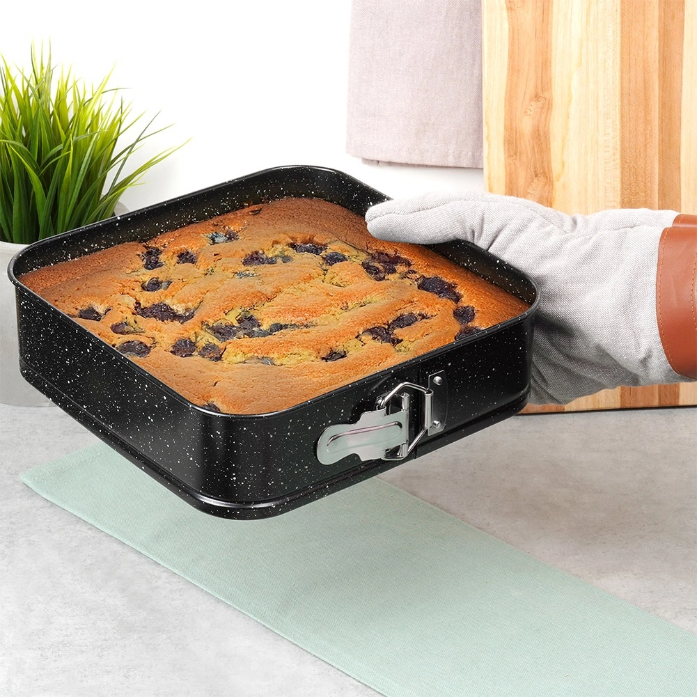 Kwadratowa rozpinana forma o wymiarach 24 × 24 × 6,8 cm to niezawodny wybór do codziennego pieczenia. Dzięki rozpinanym bokom i wyjmowanemu dnu wyjmiesz gotowe ciasto bez naruszania kształtu i przy minimalnym wysiłku. Granitowa nieprzywierająca warstwa ogranicza potrzebę użycia tłuszczu i ułatwia czyszczenie.
