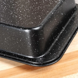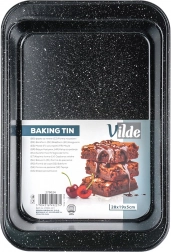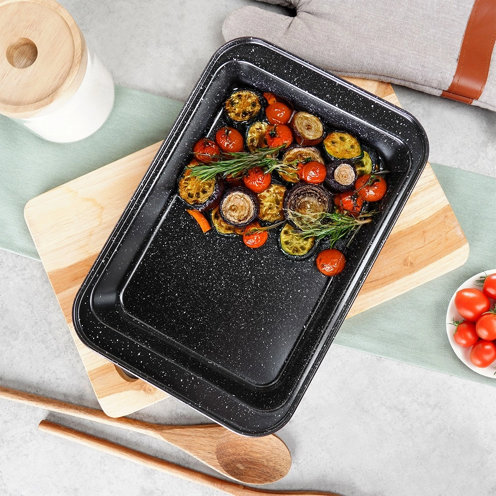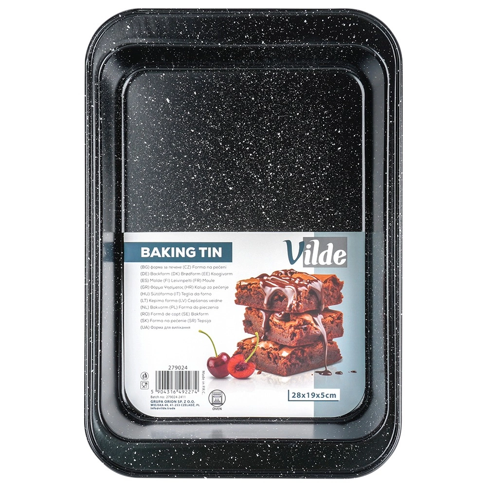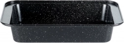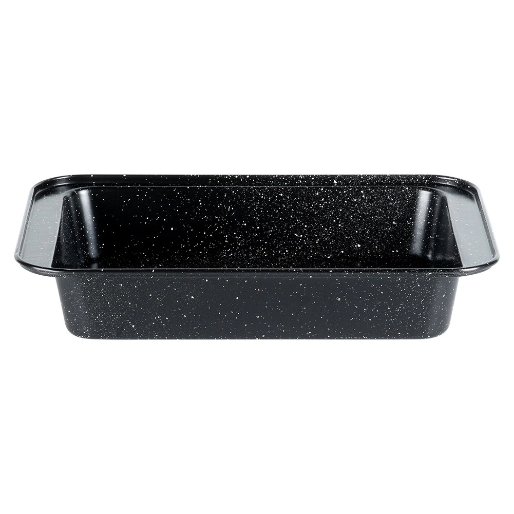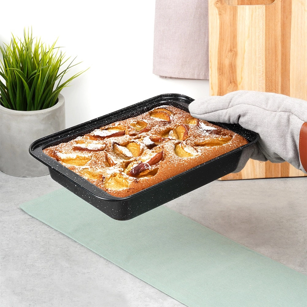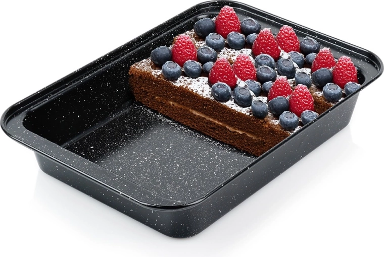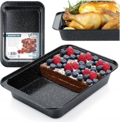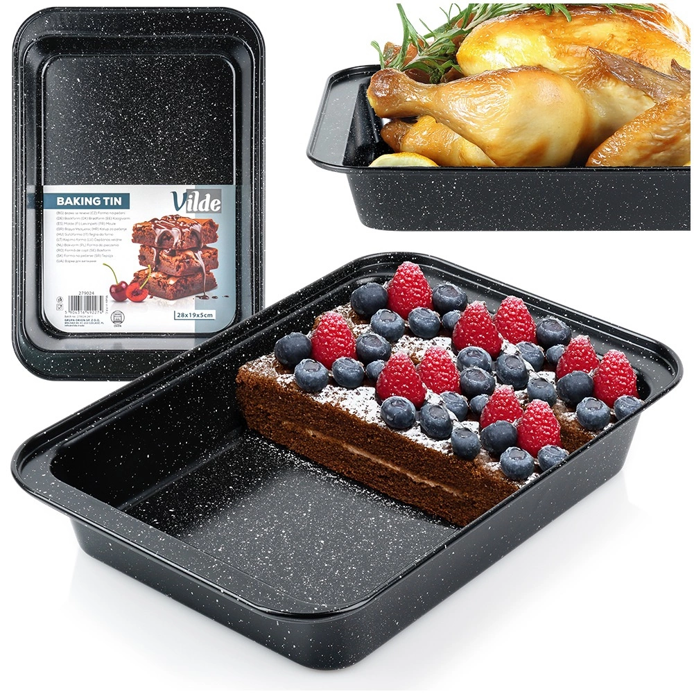Praktyczna prostokątna forma do pieczenia o wymiarach 28 × 19 × 5 cm z wytrzymałej stali z granitową powłoką nieprzywierającą dla równomiernego pieczenia bez przypalania. Idealna do mięsa, warzyw, ciast i zapiekanek. Łatwa w czyszczeniu, odpowiednia do piekarników gazowych i elektrycznych do 230 °C.