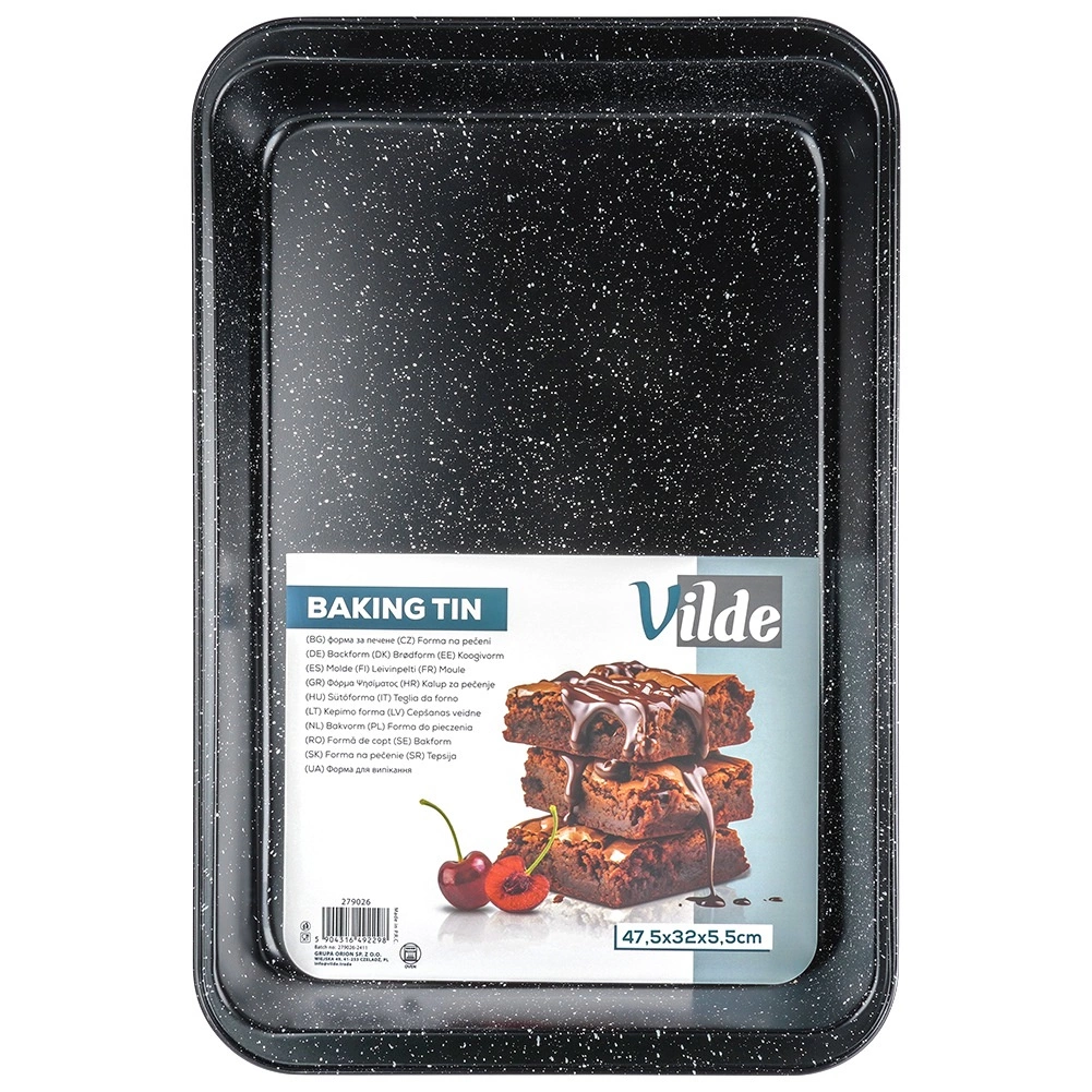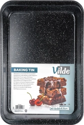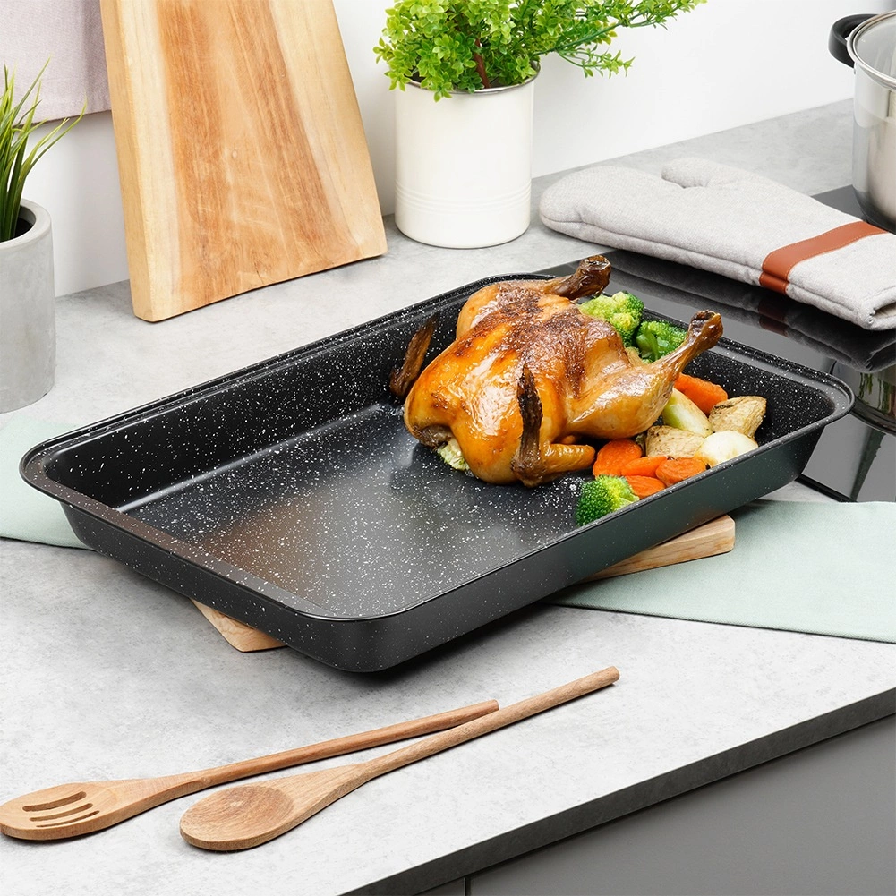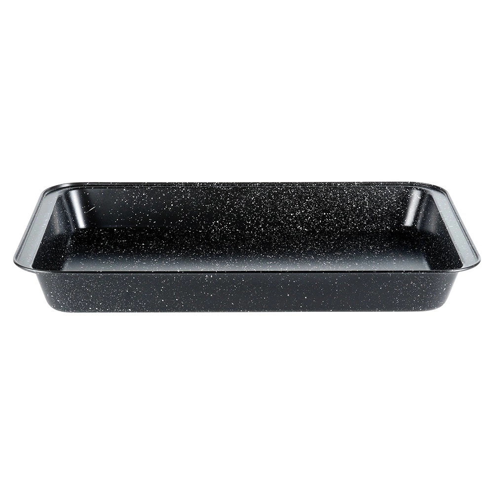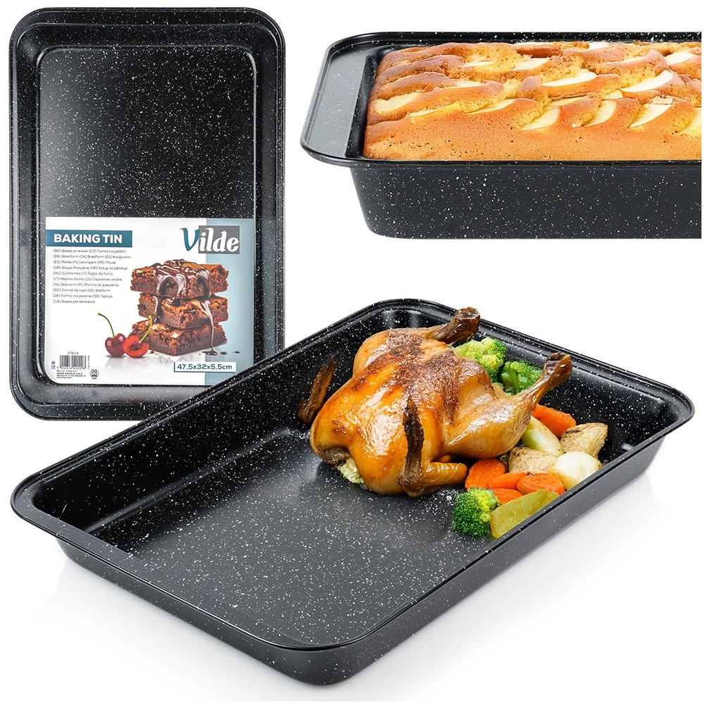 Solidna prostokątna forma z granitową powłoką zapewnia niezawodny efekt pieczenia bez przypalania. Nie pochłania zapachów ani płynów, a dzięki wysokiej jakości stali węglowej doskonale przewodzi ciepło, dzięki czemu potrawy są równomiernie wypieczone na całej powierzchni.