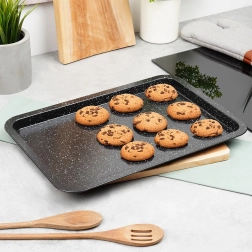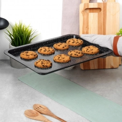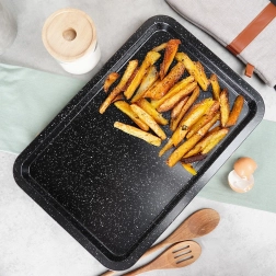 Specjalna powłoka granitowa zapobiega przywieraniu i ułatwia wyjmowanie potraw, dzięki czemu upieczone ciasteczka czy frytki łatwo zdejmiesz z blachy, a sprzątanie zajmie chwilę.