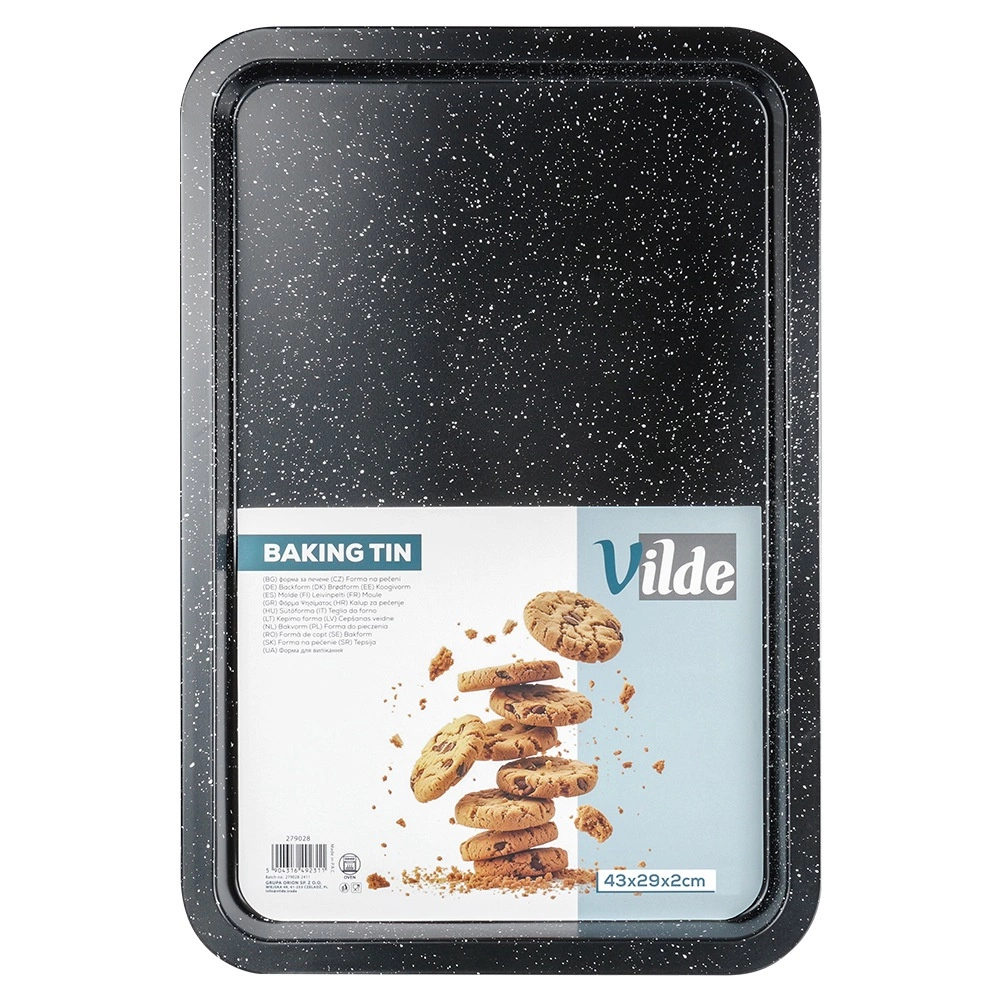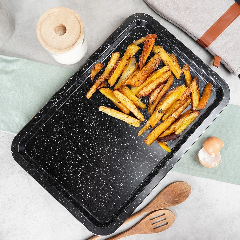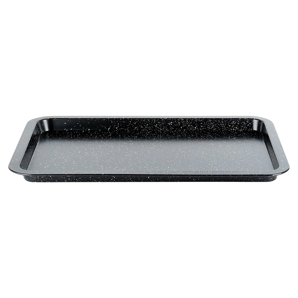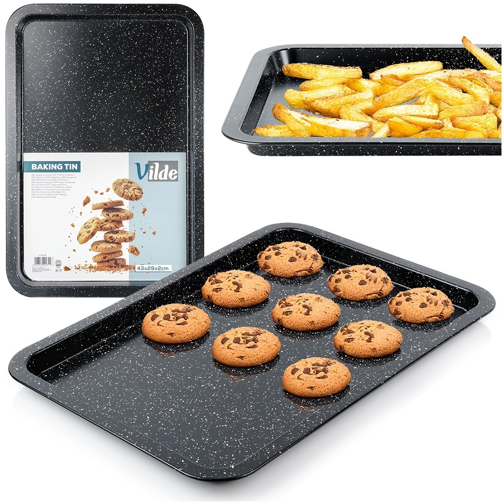 Uniwersalna granitowa blacha do pieczenia o wymiarach 43 × 29 × 2 cm do codziennego pieczenia oraz na świąteczny stół. Dzięki powierzchni z powłoką granitową oferuje nieprzywieranie, równomierne rozprowadzanie ciepła i łatwe czyszczenie. Wyższe krawędzie zapewniają bezpieczne przenoszenie i zapobiegają wyciekaniu soków. Idealna do mięsa, warzyw, ciasteczek, frytek i domowej pizzy.