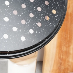 Pieczenie domowej pizzy z idealnie chrupiącym spodem. Perforowane dno zapewnia lepszą cyrkulację powietrza i szybsze odprowadzanie pary, dzięki czemu ciasto piecze się równomiernie i pozostaje pięknie chrupiące. Nieprzywierająca granitowa warstwa minimalizuje przypalanie nawet przy małej ilości tłuszczu i ułatwia czyszczenie.