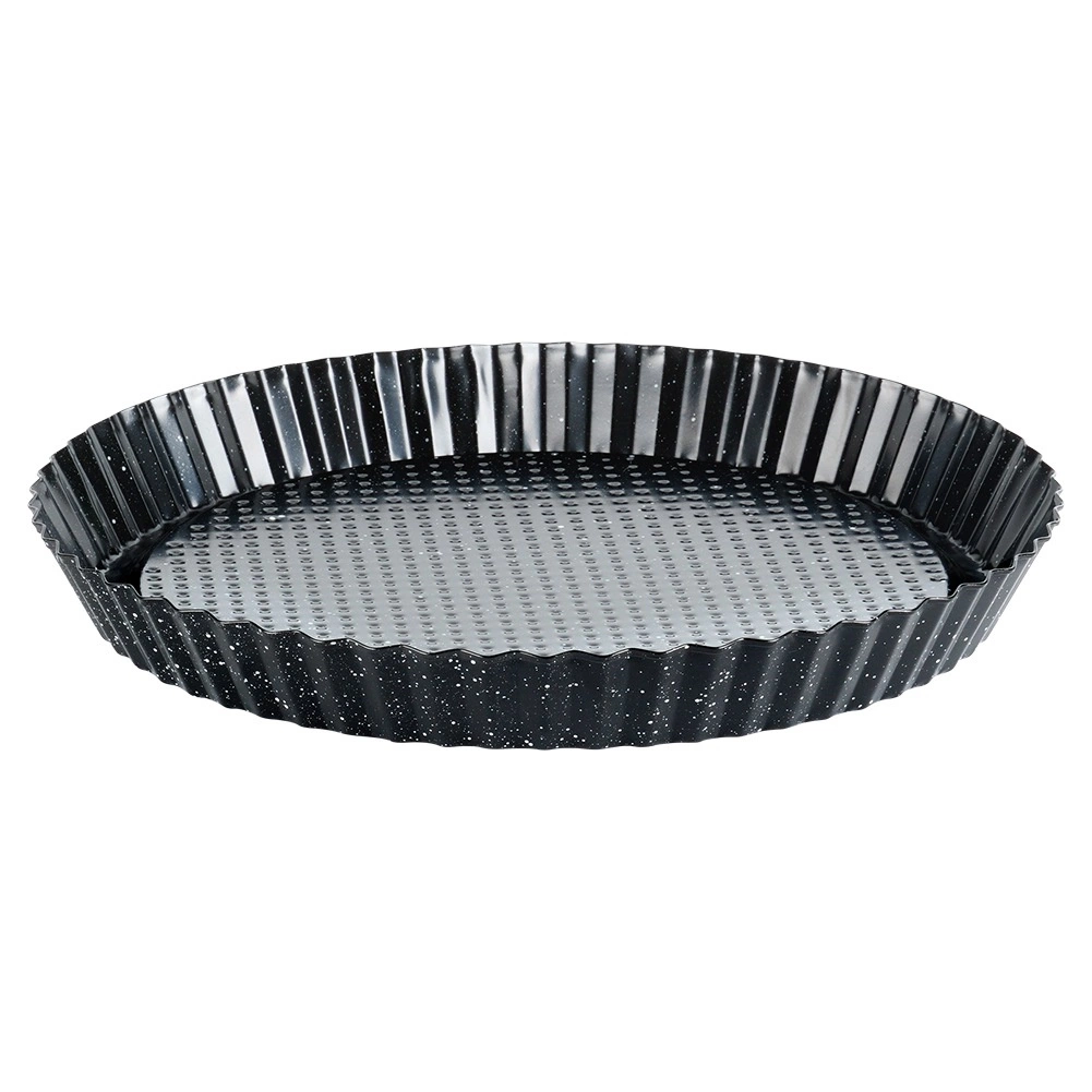 Odkryj niezawodną pomocnicę do domowego pieczenia – granitową formę do tarty o wymiarach 28 × 3 cm. Wysokiej jakości stal węglowa z nieprzywierającą granitową powłoką zapewnia perfekcyjne wypieczenie spodu i nadzienia, łatwe wyjmowanie gotowego deseru oraz wygodne czyszczenie. Pofalowane, profilowane brzegi nadają Twoim wypiekom profesjonalny wygląd.