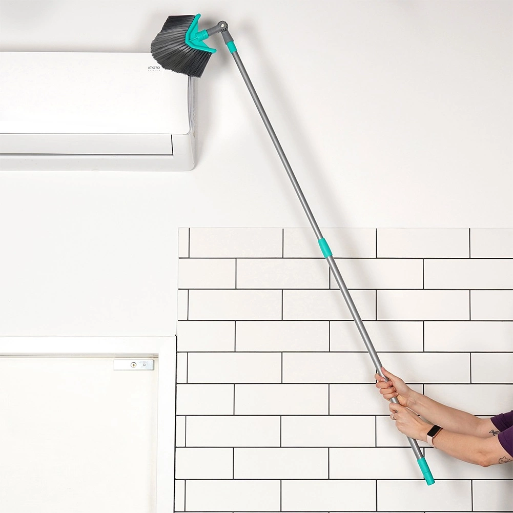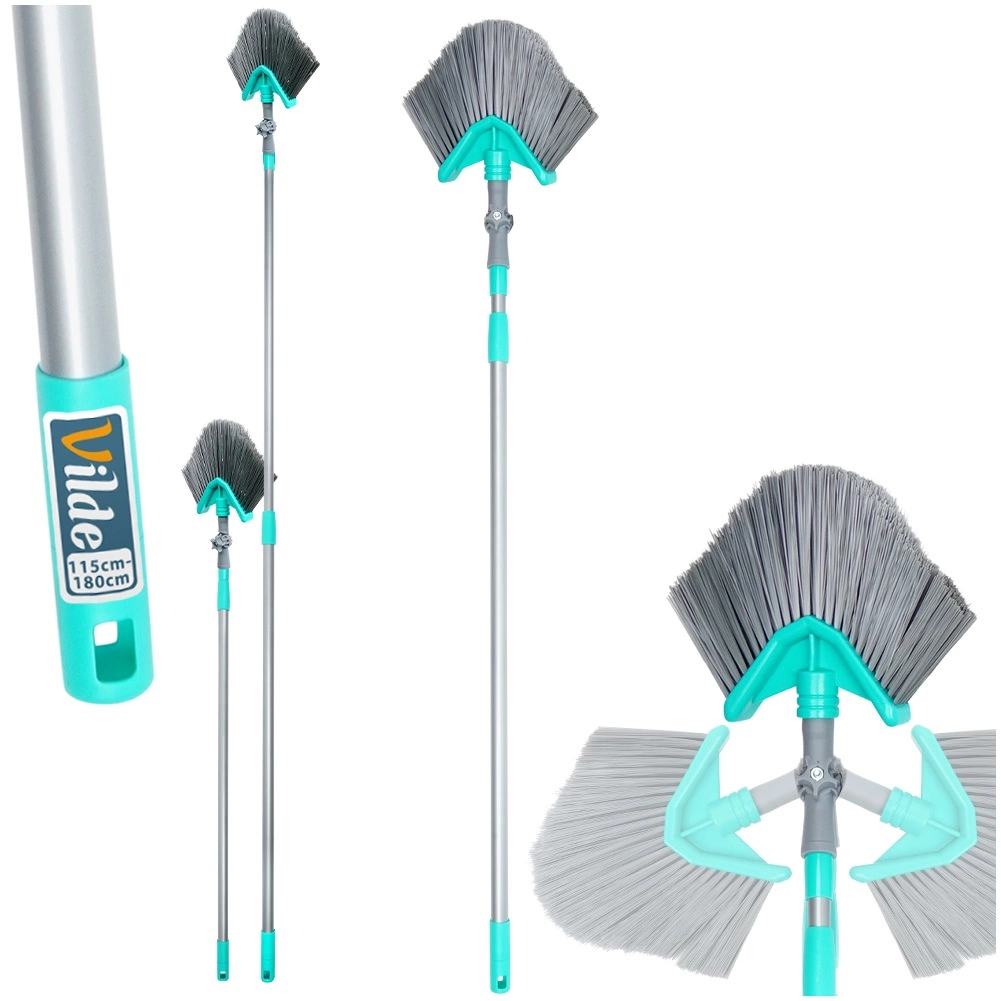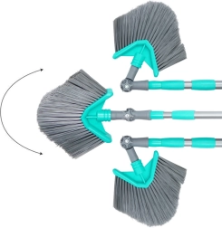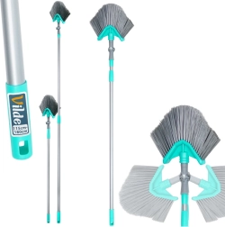 Ta uniwersalna miotła z teleskopowym trzonkiem poradzi sobie ze sprzątaniem także w trudno dostępnych miejscach. Trójkątna głowica z możliwością obracania i ustawiania pod kątem precyzyjnie czyści narożniki, krawędzie przy suficie oraz górne półki. Dzięki płynnej regulacji długości 115–180 cm łatwo dopasowuje się do Twoich potrzeb i ogranicza konieczność używania drabiny.