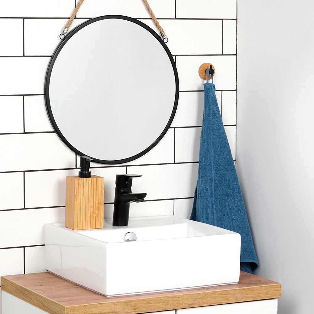 Okrągła bambusowa podstawa w połączeniu z czarnym metalowym trzpieniem dodaje wnętrzu nowoczesnego, eleganckiego akcentu i świetnie komponuje się z łazienką oraz kuchnią.