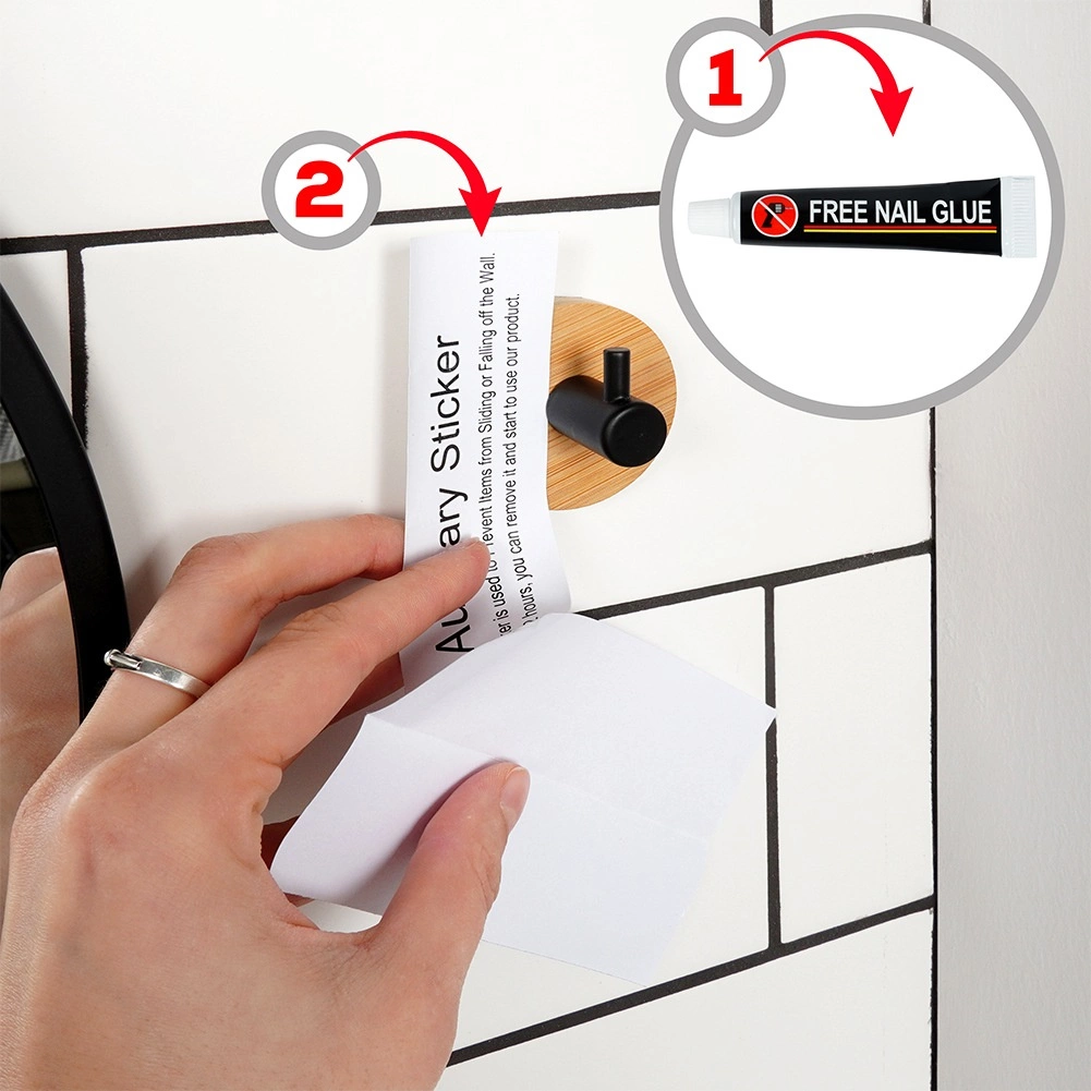 Montaż jest szybki i czysty: haczyk mocujesz za pomocą dołączonego kleju i pomocniczych naklejek. Dla najlepszego efektu przed montażem dokładnie oczyść i odtłuść powierzchnię oraz pozostaw klej do utwardzenia przez ok. 72 godziny przed pierwszym obciążeniem.