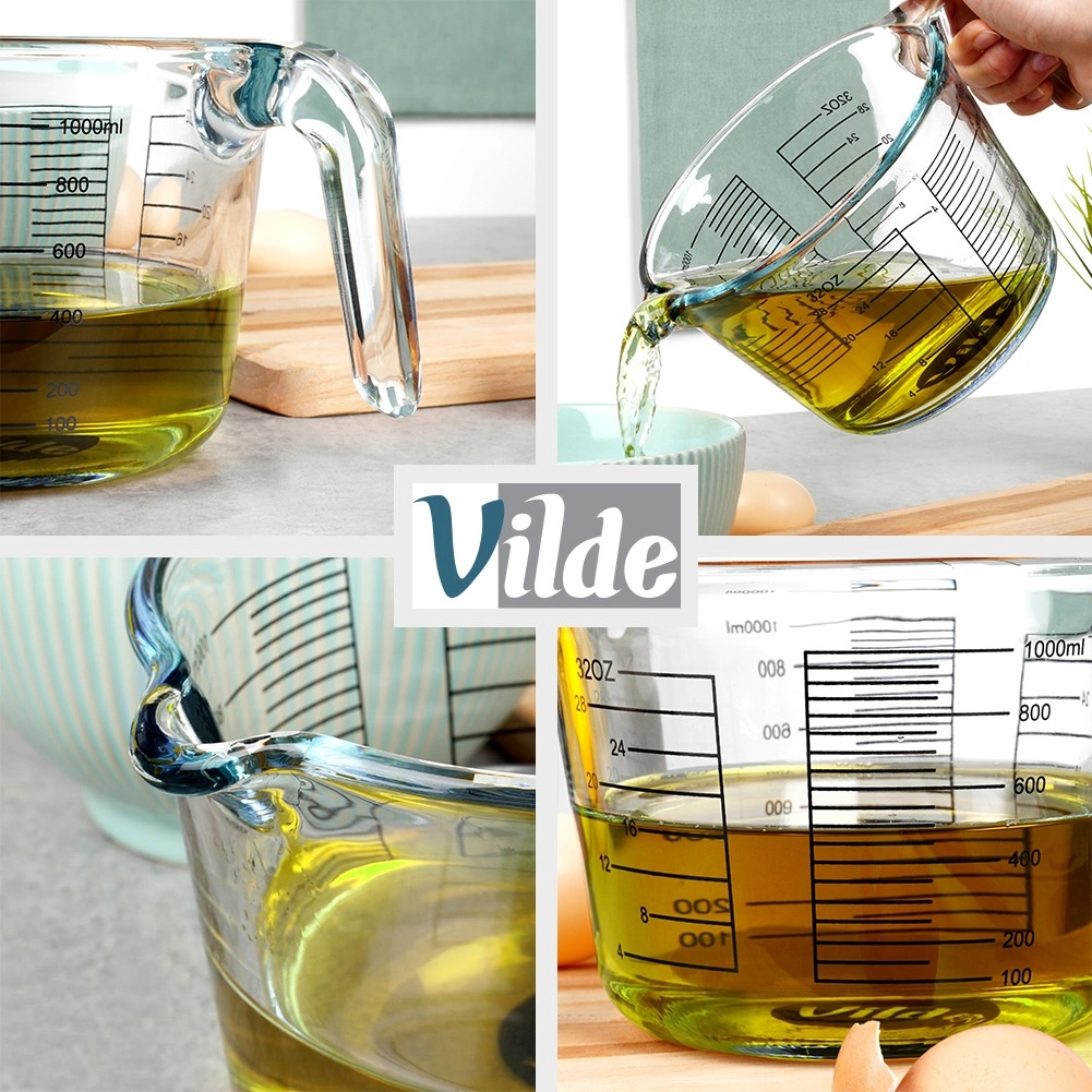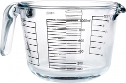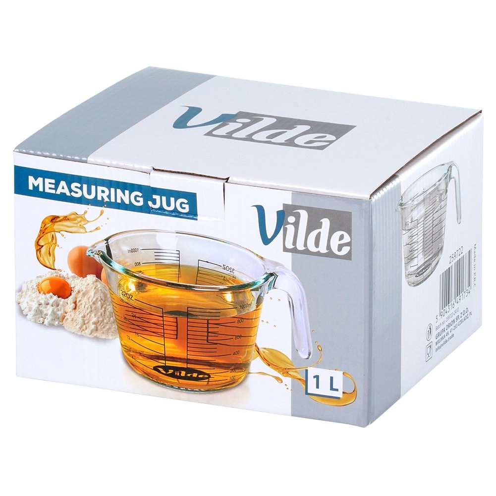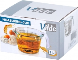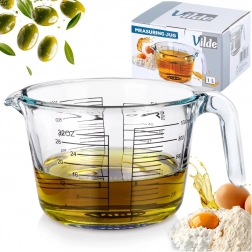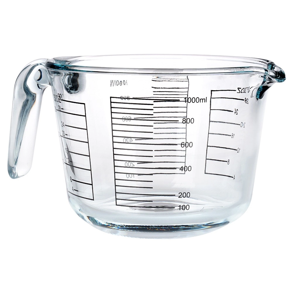 Praktyczna szklana miarka o pojemności 1 l z ergonomicznym uchem i dzióbkiem do łatwego nalewania. Dzięki czytelnej podziałce w ml i fl oz precyzyjnie i wygodnie odmierzysz płyny. Wykonana z szkła borokrzemowego, odpornego na szoki termiczne, odpowiednia do zmywarki, mikrofali i piekarnika.