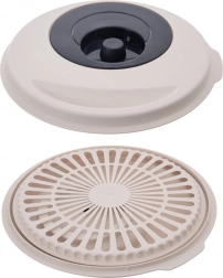 - Plastik (przezroczysta misa, szary kosz, biała pokrywa z szarymi elementami)