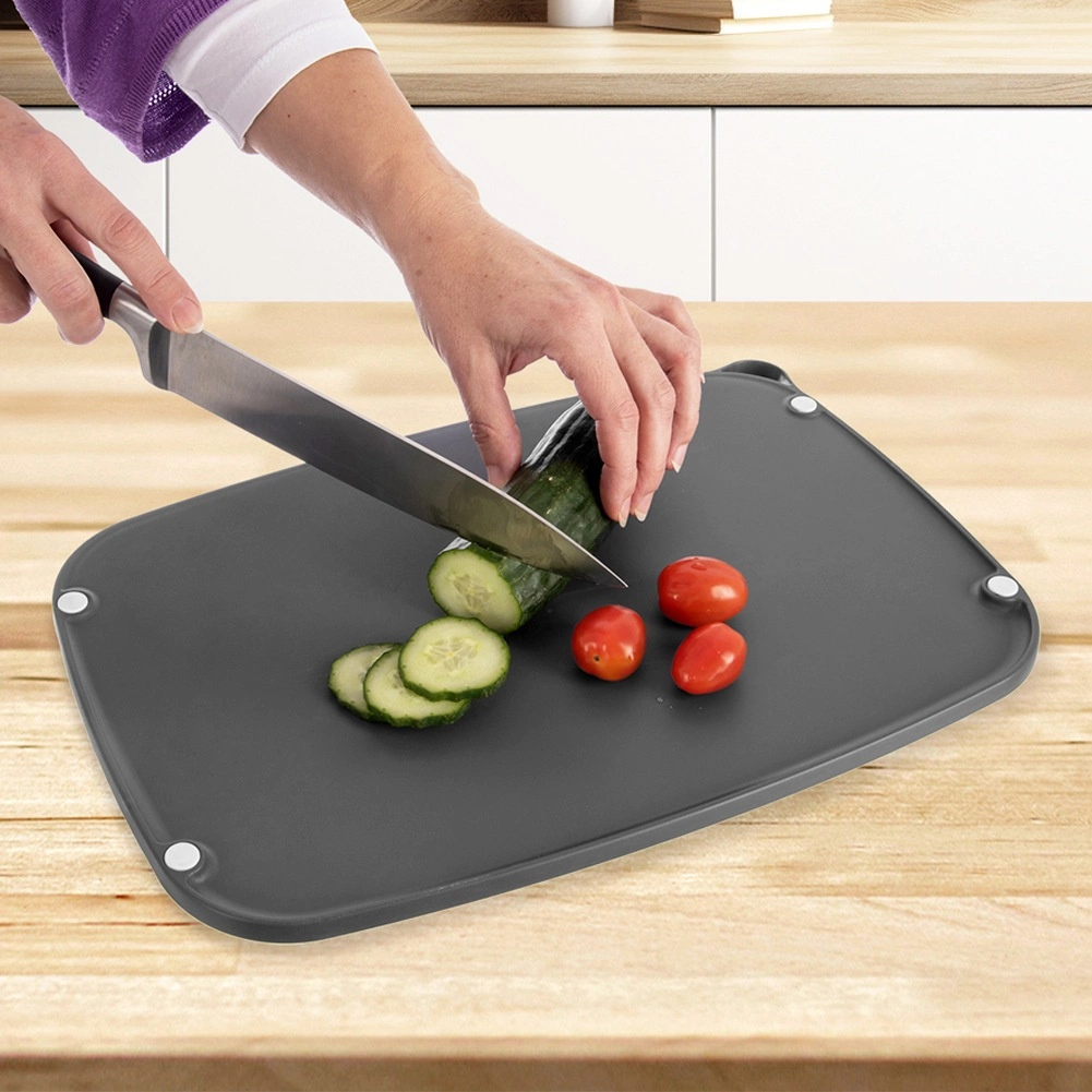 Deska wykonana jest z trwałego, bezpiecznego w kontakcie z żywnością plastiku w eleganckim szarym kolorze. Łatwa w utrzymaniu – można myć w zmywarce i wytrzymuje temperatury do +95 °C. Praktyczny otwór ułatwia zawieszenie i oszczędne przechowywanie.