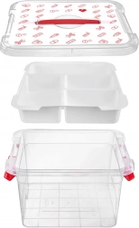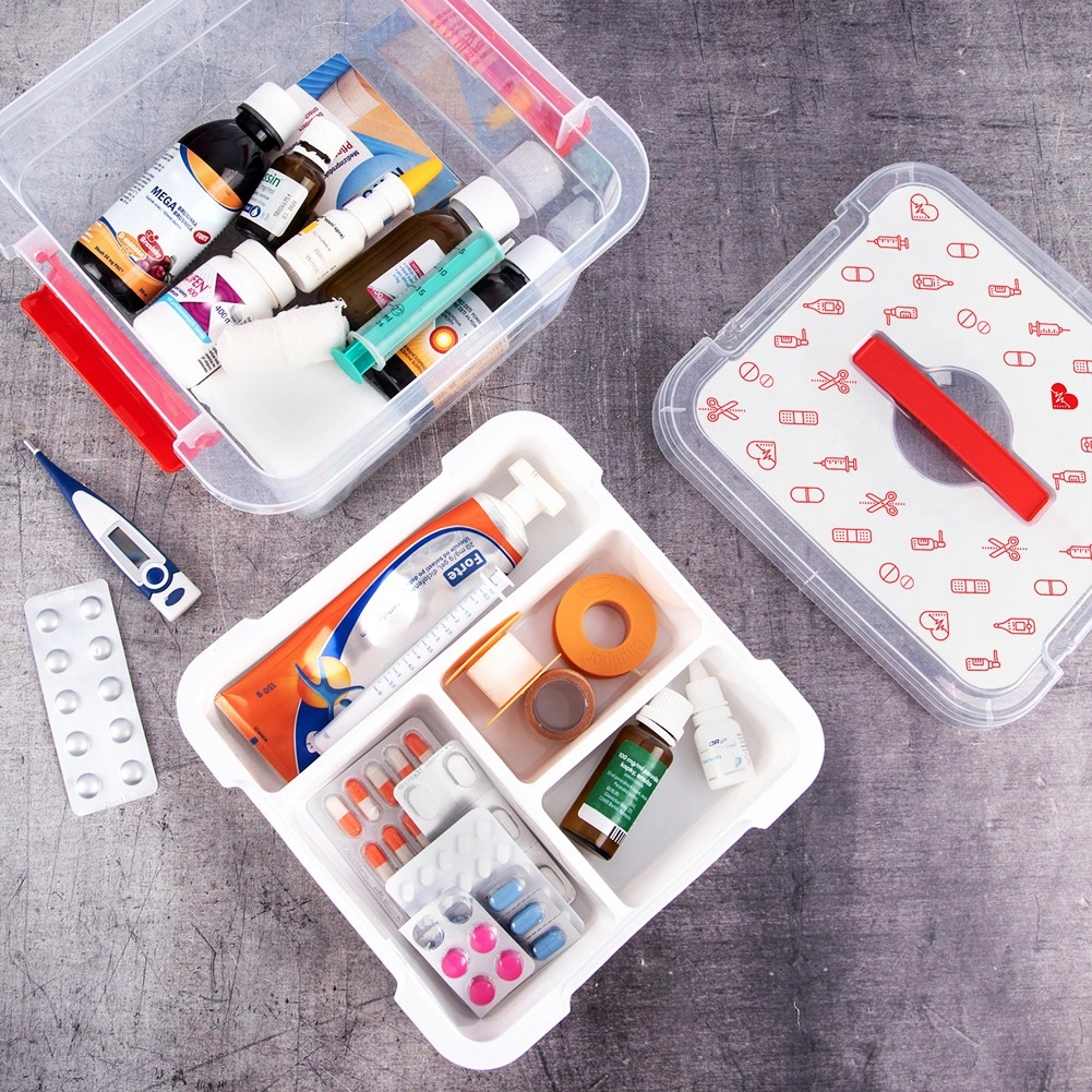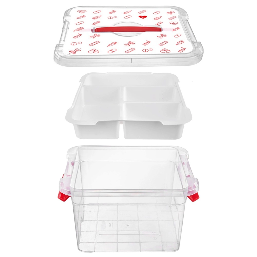 Pudełko wykonano z wytrzymałego plastiku z mocnymi klipsami zamykającymi i ergonomicznym uchwytem dla bezpiecznego przenoszenia. Pokrywa z czerwonymi ikonami (tabletki, termometry, strzykawki, buteleczki, plastry) jasno wskazuje przeznaczenie – domowa apteczka. Sprawdzi się w gospodarstwach domowych, placówkach medycznych, aptekach i domach opieki.