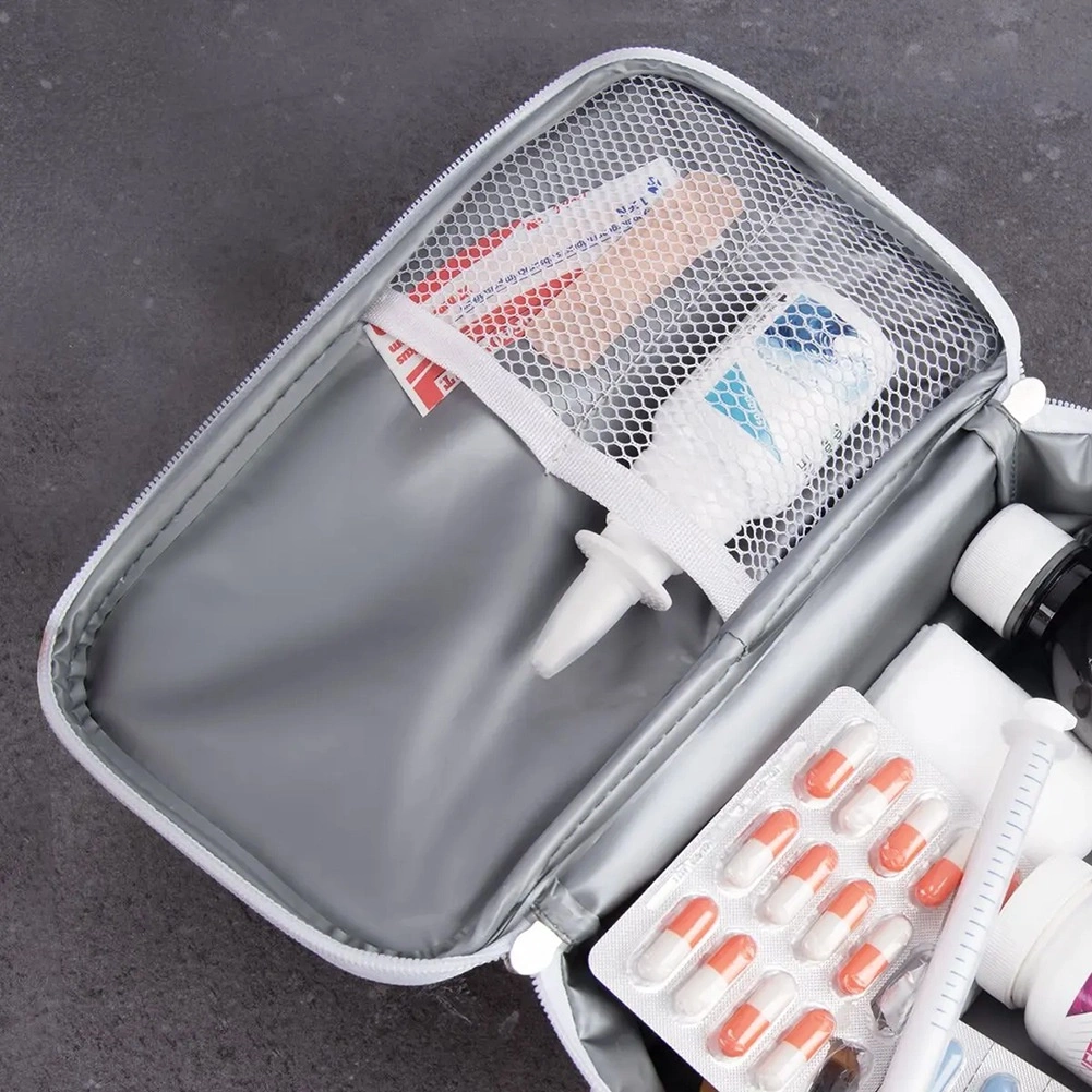 - Praktyczny podział – siatkowana kieszeń z dwiema sekcjami na drobiazgi i medykamenty.
