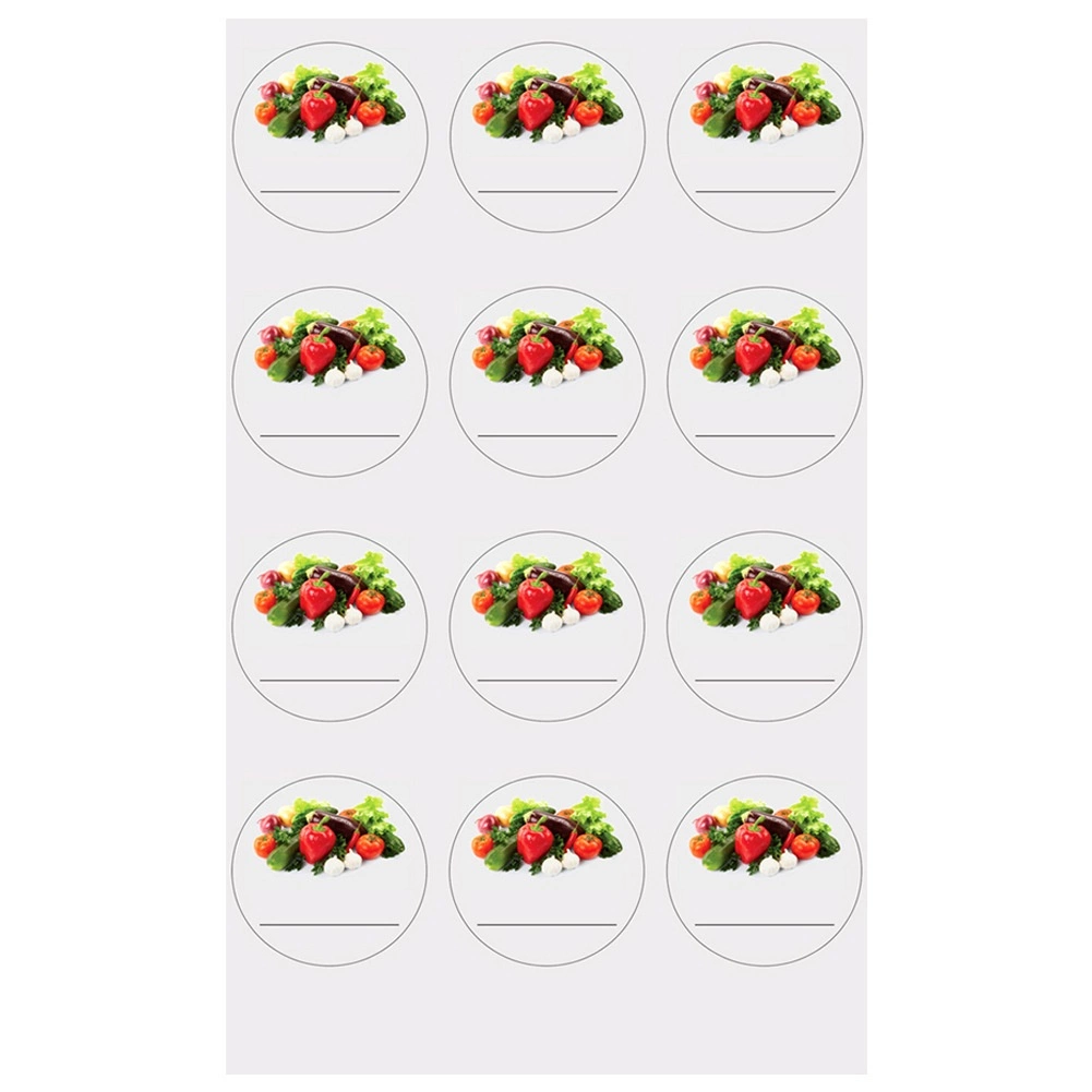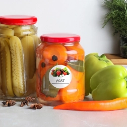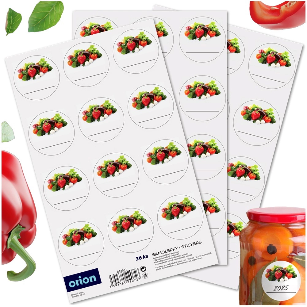 Praktyczny zestaw 36 samoprzylepnych etykiet na słoiki i butelki o średnicy 3,5 cm. Etykiety z laminowanego papieru z motywem warzyw łatwo się przyklejają bez dodatkowego kleju i mają miejsce na nazwę, datę lub skład. Świetne do utrzymania porządku w spiżarni i eleganckiego oznaczania domowych przetworów.