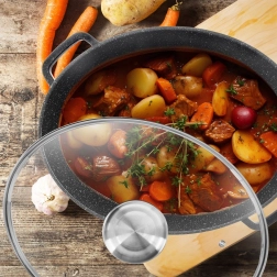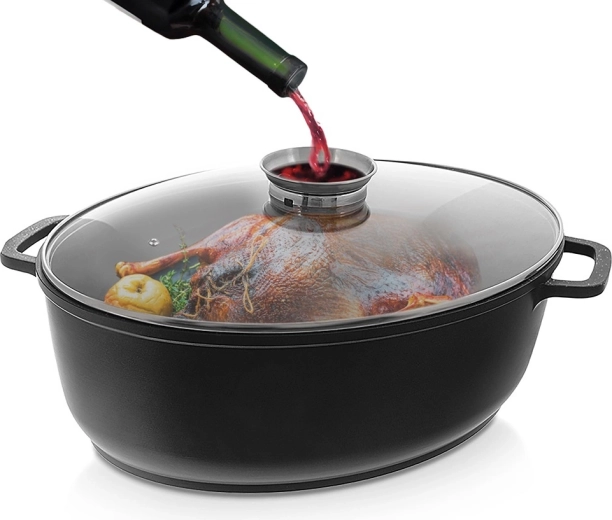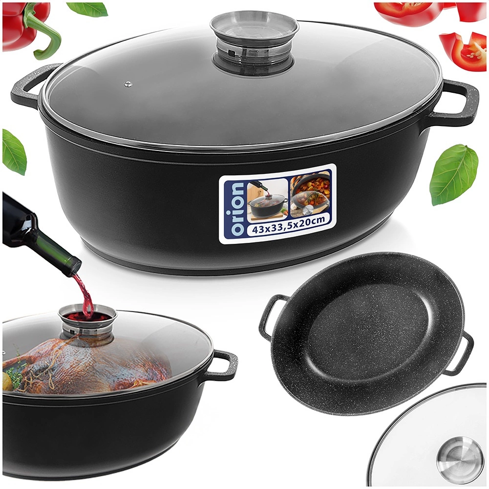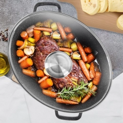 Wysokopojemna owalna brytfanna o pojemności 12 l z żaroodporną szklaną pokrywą i nieprzywierającą granitową powłoką PFLUON GRANIT. Idealna do pieczenia, duszenia i gotowania całych kawałków mięsa, takich jak kurczak, kaczka czy gęś. Odpowiednia do piekarnika i na wszystkie typy kuchenek, w tym indukcję, z praktycznym dozownikiem płynnych przypraw w pokrywie oraz możliwością mycia w zmywarce.