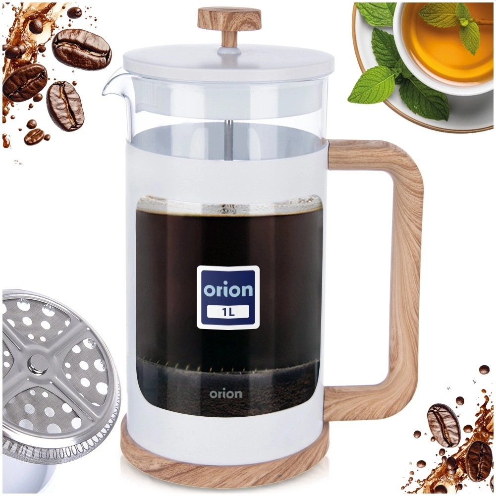 Stylowy szklany french press o pojemności 1 l do przygotowywania kawy, herbaty i ziół. Dzięki precyzyjnemu mechanizmowi tłokowemu oraz drobnemu stalowemu sitku uzyskasz czysty, pełny napój bez osadu. Wytrzymała szklanka borokrzemowa, wygodne ergonomiczne ucho i praktyczny dzióbek ułatwiają codzienne użytkowanie w domu i gastronomii.
