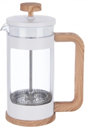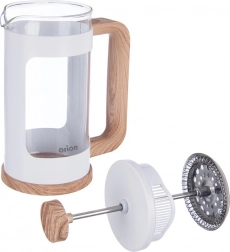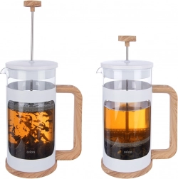 Elegancki szklany french press o pojemności 400 ml do przygotowywania kawy, herbaty i naparów ziołowych. Łączy szkło borokrzemowe z elementami w dekorze drewna i białą ramą. Wyposażony w drobne stalowe sitko dla czystego napoju bez fusów, ergonomiczny uchwyt oraz precyzyjny dzióbek dla wygodnego serwowania. Szklany pojemnik jest odpowiedni do zmywarki. Sprawdzona jakość marki ORION.