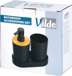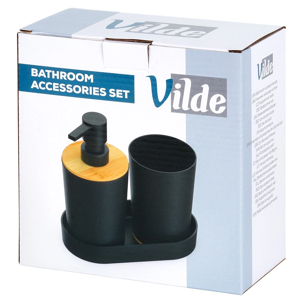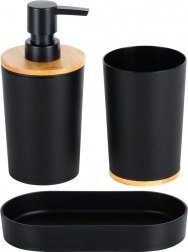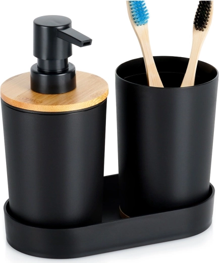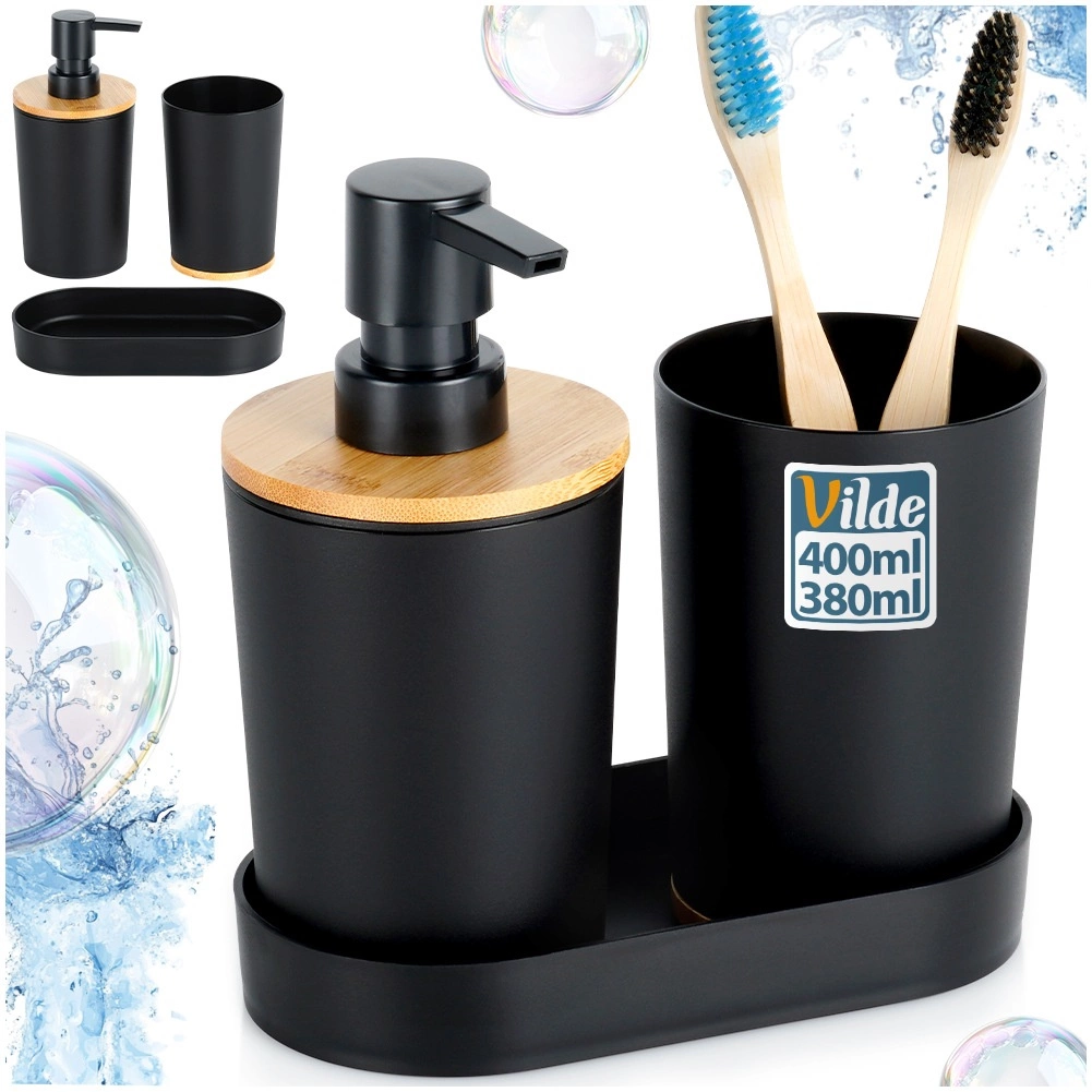 Ten praktyczny zestaw jest idealny do codziennego użytkowania przy umywalce. Dozownik do mydła w płynie z płynnym działaniem pompki, pojemny kubek na szczoteczki lub pastę oraz stabilna podstawka tworzą spójny i schludny komplet. Matowa czerń w połączeniu z naturalnym bambusem prezentuje się stylowo zarówno w nowoczesnych, jak i klasycznych wnętrzach.