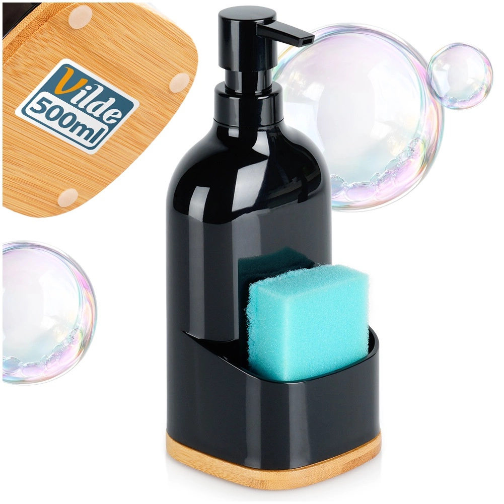 Stylowy czarny dozownik do płynu do mycia naczyń z wbudowanym uchwytem na gąbkę i bambusową podstawą utrzyma Twoją kuchnię w czystości i porządku. Ma pojemność 500 ml, wymiary 9,7 × 9,7 × 22 cm, łatwo się napełnia i dzięki antypoślizgowym podkładkom stabilnie stoi na miejscu. Elegancki dodatek do nowoczesnych, klasycznych i industrialnych wnętrz.