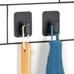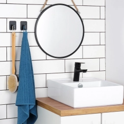 Minimalistyczne haczyki z prostokątną podstawą oferują niezawodne rozwiązanie do zawieszania codziennych akcesoriów. Wytrzymałe wykonanie z lekkiego plastiku w czarnym kolorze świetnie komponuje się z nowoczesnymi wnętrzami, a dzięki samoprzylepnej piance 3M zapewnia silną przyczepność do szkła, lustra, glazury i mebli.