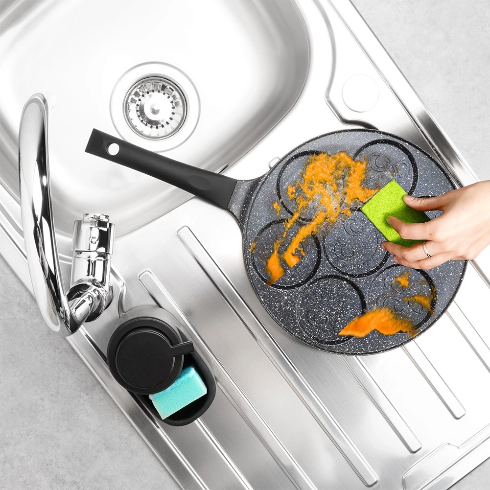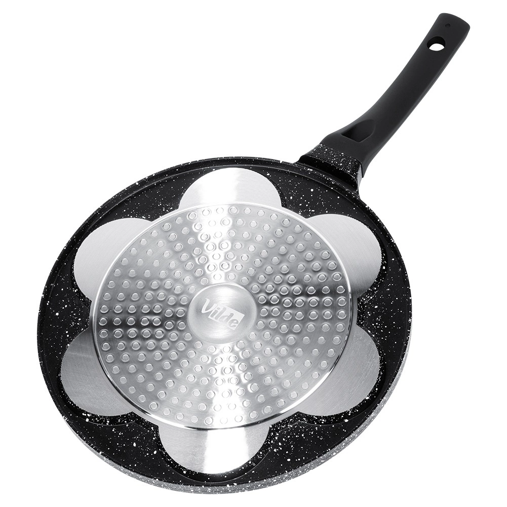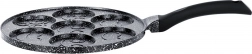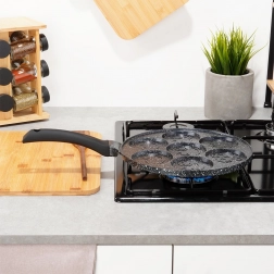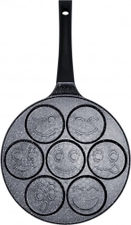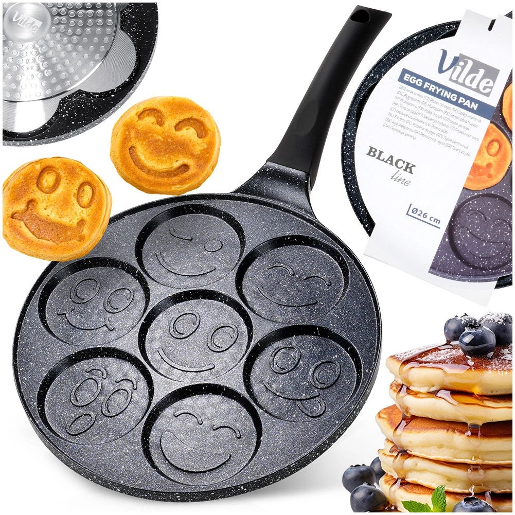 Ta stylowa patelnia z linii BLACK LINE o średnicy 26 cm wnosi radość do każdej kuchni. Siedem okrągłych wgłębień z reliefem buziek tworzy idealnie uformowane placuszki, mini naleśniki lub jajka sadzone, które pokochają dzieci i dorośli. Aluminiowy korpus z nieprzywierającą granitową powłoką ogranicza przypalanie i pozwala na zdrowsze przygotowanie potraw z minimalną ilością tłuszczu.