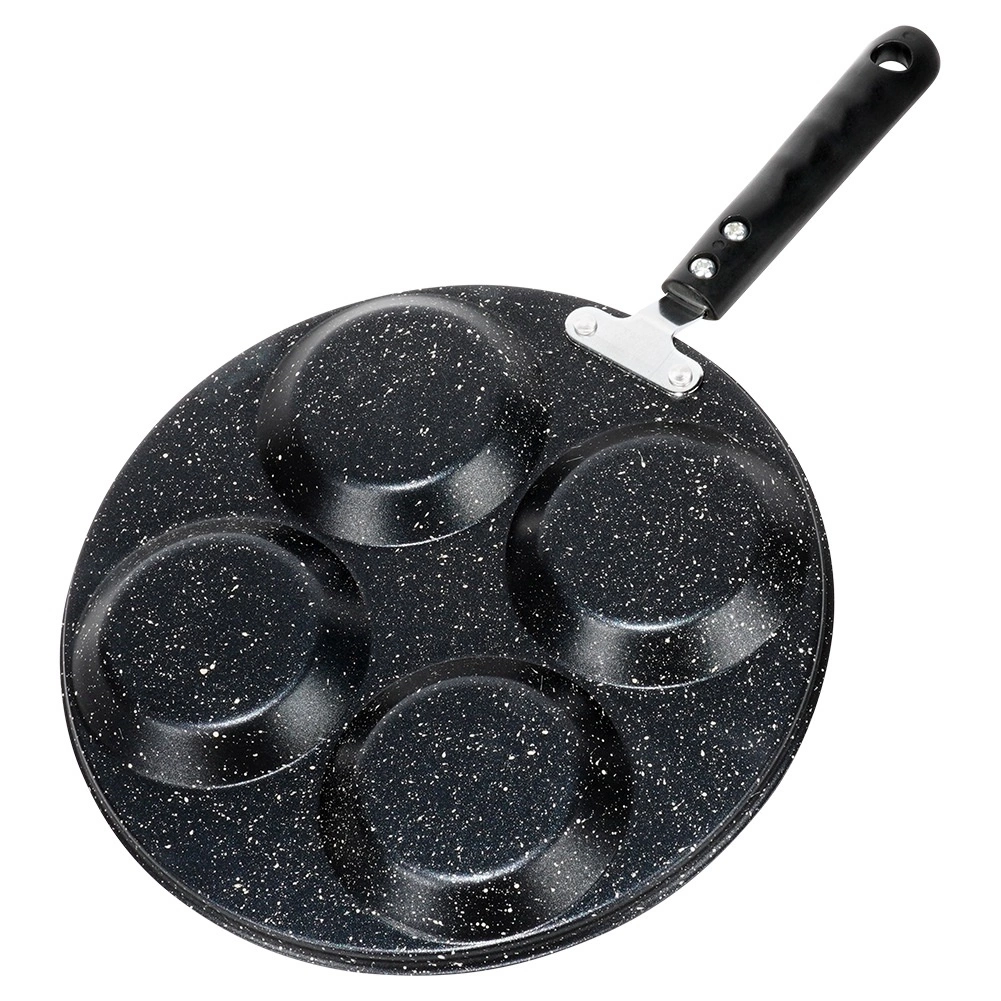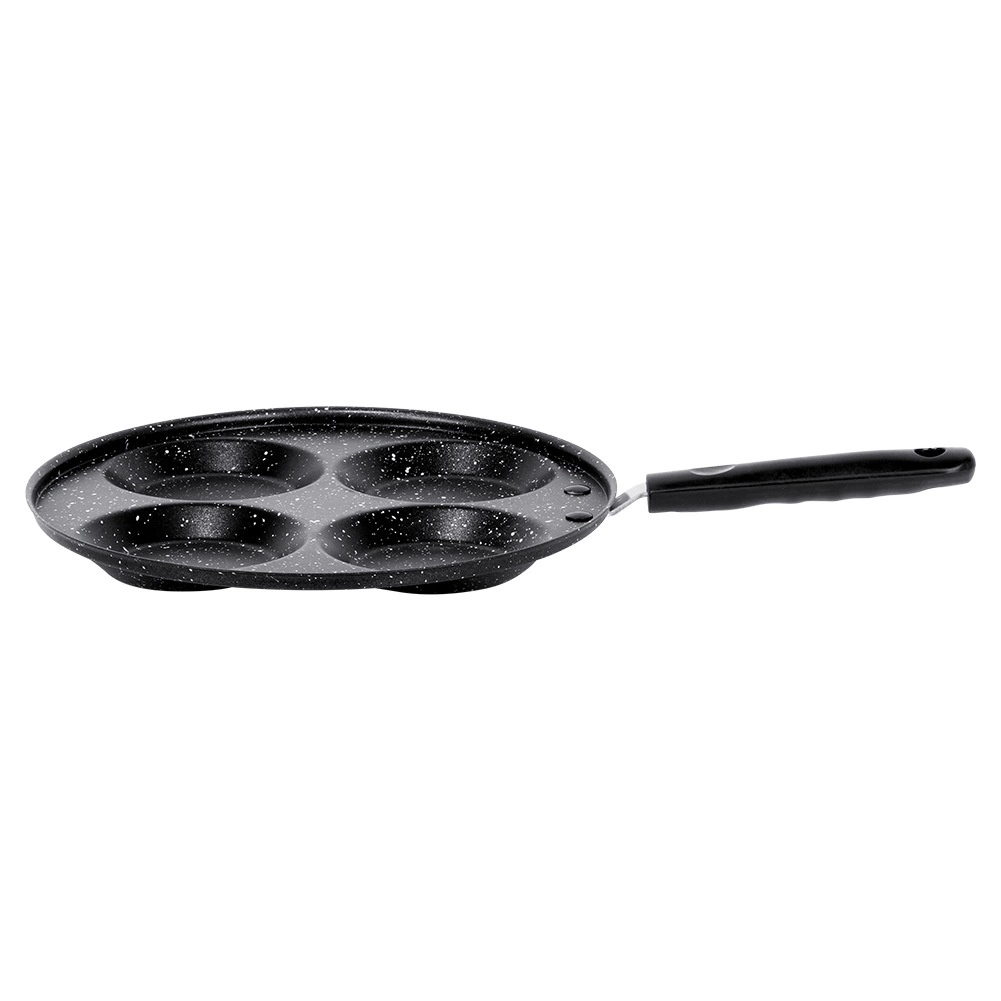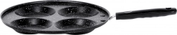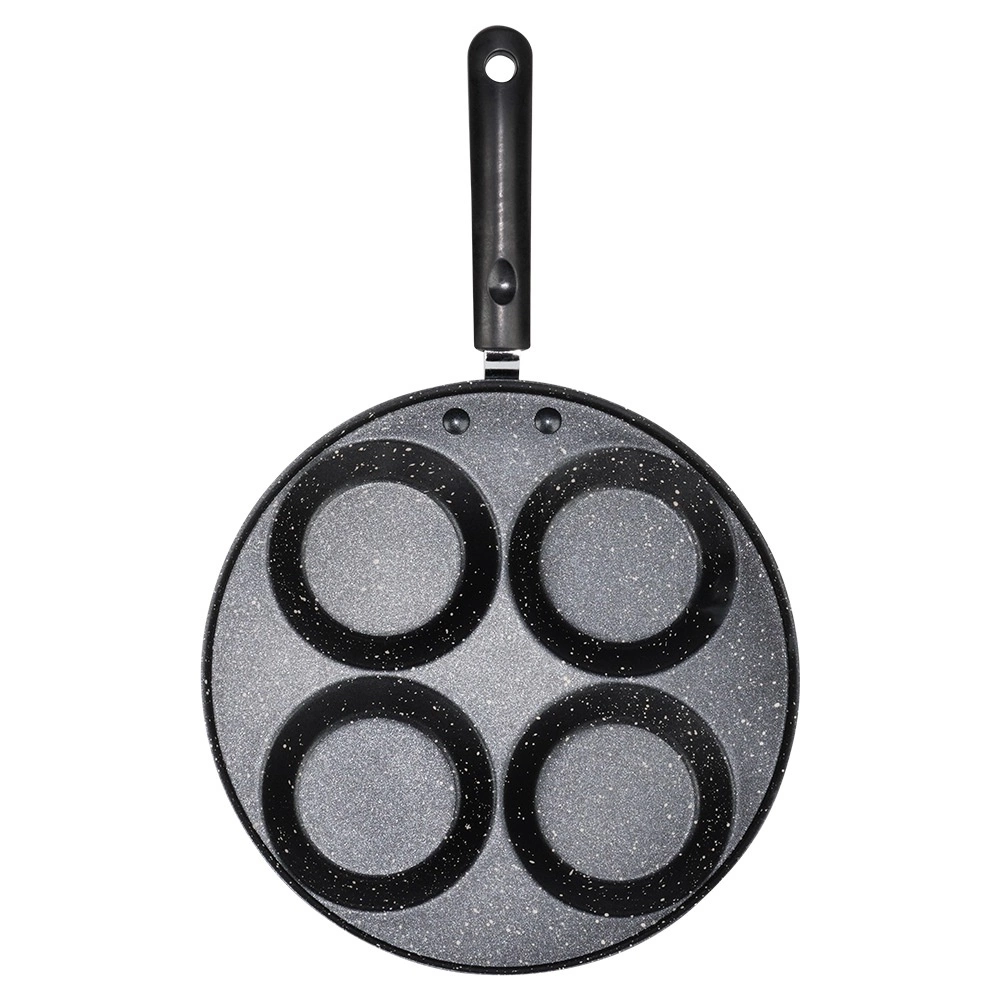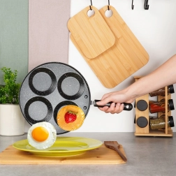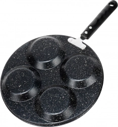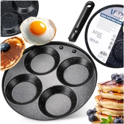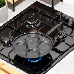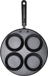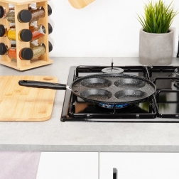 Ta granitowa patelnia z 4 okrągłymi formami jest idealna do przygotowywania jajek, placuszków i mini naleśników w doskonale regularnym kształcie. Oszczędza czas i energię: materiał świetnie przewodzi ciepło i zapewnia równomierne smażenie bez przypalania.