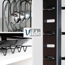 Poziomy półek łatwo przesuniesz tak, aby w stojaku zmieściły się zarówno małe, jak i duże patelnie, głębokie garnki oraz wysokie pokrywki.