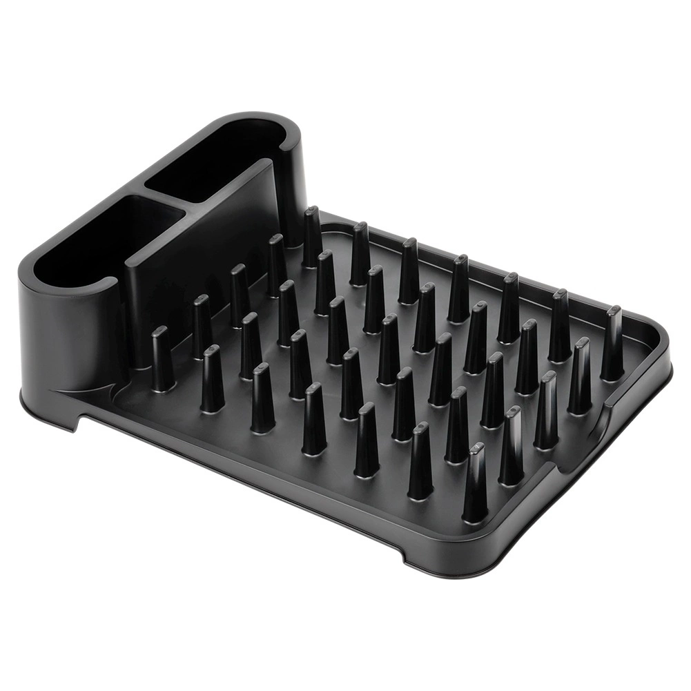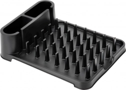 Praktyczny ociekacz na naczynia w eleganckim czarnym kolorze o wymiarach 41 × 32,5 × 11 cm ułatwia suszenie talerzy, szklanek i sztućców, a jednocześnie chroni blat kuchenny przed wodą. Ma solidną i wytrzymałą konstrukcję, oddzielny organizer na sztućce oraz przemyślane dno do odprowadzania wody, dzięki czemu przestrzeń przy zlewie pozostaje czysta i uporządkowana.