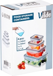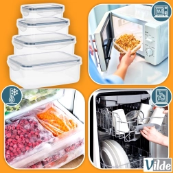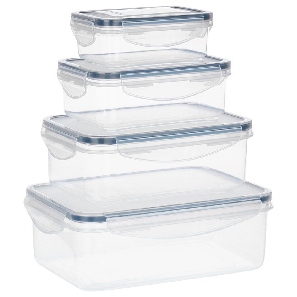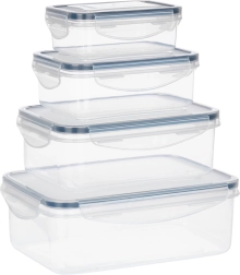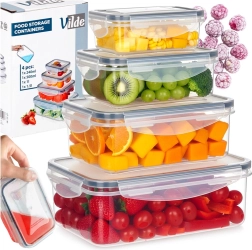 Praktyczny zestaw czterech przezroczystych pojemników z pokrywkami i silikonową uszczelką utrzyma Twoje jedzenie dłużej świeże i bezpiecznie przechowywane. Różne rozmiary do przechowywania i meal prep, hermetyczne zamknięcie dzięki czterem klipsom, bez BPA oraz odpowiednie do zmywarki, mikrofalówki (bez pokrywki) i zamrażarki.