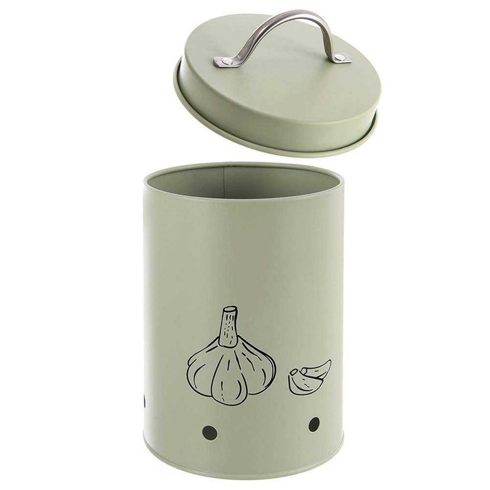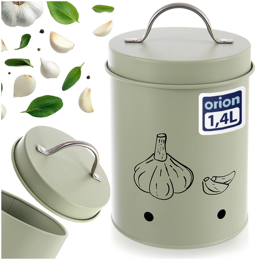 Stylowy i praktyczny pojemnik do przechowywania warzyw i owoców, idealny szczególnie na czosnek. Dzięki pojemności 1,4 l, skutecznej wentylacji i pokrywce z wygodnym uchwytem produkty pozostają dłużej świeże. Wykonany z trwałego metalu w pastelowej zieleni, sprawdzi się także jako dekoracyjny element kuchni.