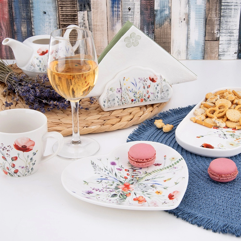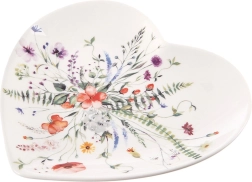 Elegancki talerzyk deserowy w kształcie serca z wysokiej jakości porcelany z motywem łąkowych kwiatów. Idealny do serwowania deserów i przekąsek, odpowiedni do zmywarki i mikrofalówki, doskonale uzupełni każdą zastawę stołową i zachwyci efektownym designem.