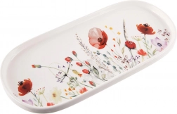 Wnieś na stół świeżość kwitnącej łąki. Owalny porcelanowy talerz z dekoracyjnym wzorem maków i polnych kwiatów sprawdzi się do stylowego serwowania tapas, serów, owoców, deserów czy dodatków. Dzięki gładkiej glazurze łatwo się czyści, a podwyższone krawędzie pomagają utrzymać podawane smakołyki na miejscu.