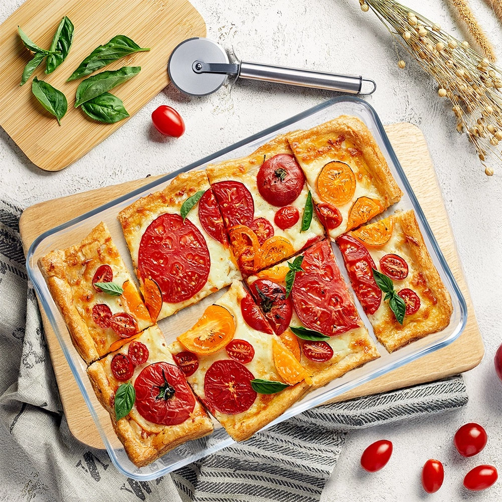 Ta niska szklana misa doskonale nadaje się do przygotowywania ciasteczek, deserów, warzyw i mięsa. Przezroczyste szkło borokrzemowe umożliwia wygodną kontrolę pieczenia, a jednocześnie jest wystarczająco odporne do codziennego użytku. Stylowy wygląd świetnie sprawdzi się także do bezpośredniego serwowania na stół.