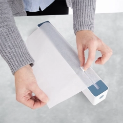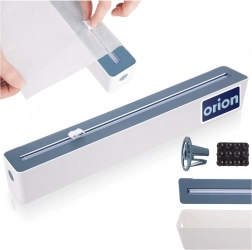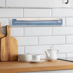 Dyspenser obsługuje folię spożywczą, folię aluminiową oraz papier do pieczenia. Dzięki dołączonym przyssawkom i dwustronnej taśmie 3M przymocujesz go do gładkich powierzchni bez wiercenia lub po prostu schowasz do szuflady. Wymiana rolki to kwestia sekund – naciśnij boczne zatrzaski, umieść rolkę na uchwytach i możesz ciąć.