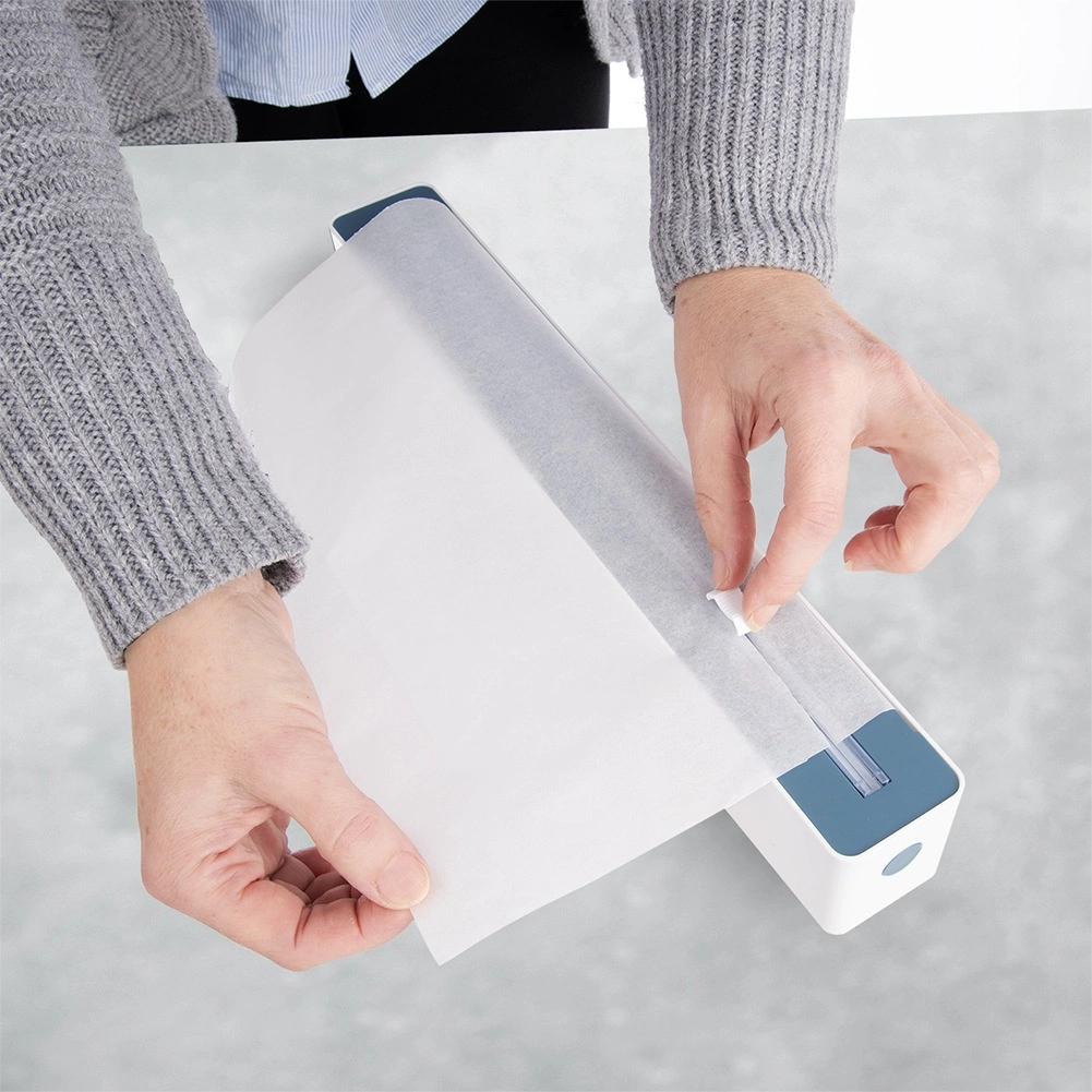 Utrzymaj kuchnię w idealnym porządku dzięki eleganckiemu dyspenserowi, który łączy szybkie odmierzanie, czyste cięcie bez strzępienia i wygodne przechowywanie rolek. Zintegrowana listwa z ostrą krawędzią tnie płynnie i równo, a wewnętrzne ograniczniki zapobiegają przemieszczaniu się rolki.