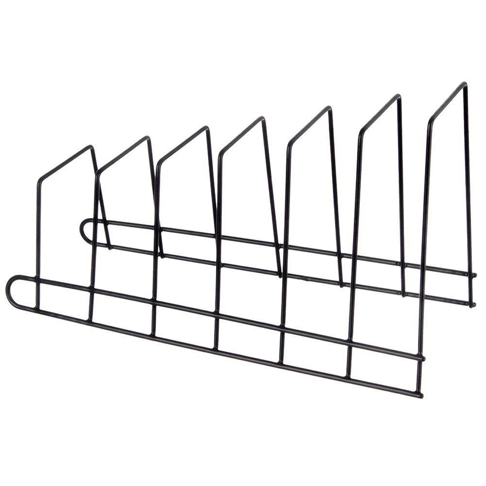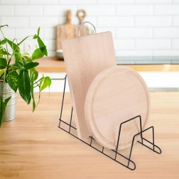 Ten czarny metalowy stojak idealnie nadaje się do przejrzystego przechowywania pokrywek, płaskich talerzy, blach do pieczenia czy desek do krojenia. Otwarta, druciana konstrukcja utrzymuje wszystko w pozycji pionowej i oddzielnie, co poprawia cyrkulację powietrza i przyspiesza schnięcie. Dzięki uniwersalnym wymiarom 34,5 × 14 × 19 cm zmieści się na blacie, w szafce oraz w głębokiej szufladzie.