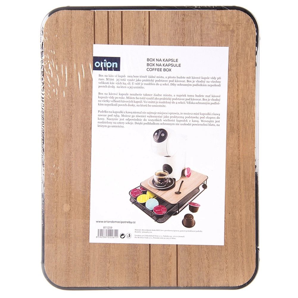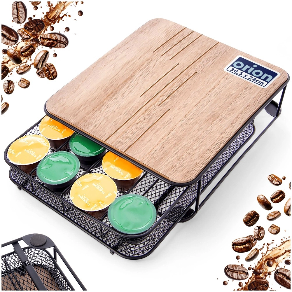 Utrzymuj porządek w kapsułkach i oszczędzaj miejsce na blacie kuchennym. Organizer łączy trwały matowy czarny metal z dekoracyjnym drewnianym blatem, dzięki czemu świetnie pasuje do nowoczesnych loftowych i klasycznych wnętrz. Szuflada z przejrzystym podziałem umożliwia szybki wybór ulubionej kawy i wygodny dostęp.