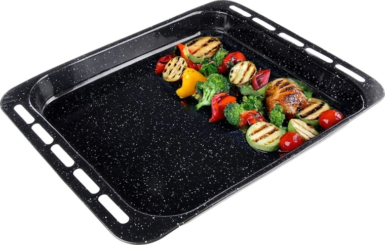 Ta uniwersalna blacha do pieczenia to świetny wybór do słodkich i słonych przepisów. Emaliowana powierzchnia zapewnia równomierne rozprowadzanie ciepła, minimalną przywieralność i długą żywotność. Dzięki podwyższonemu brzegowi świetnie nadaje się do zapiekanek, pieczenia mięsa, warzyw, ciast i drożdżówek.