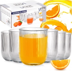 Elegancki zestaw sześciu szklanek o pojemności 250 ml z wysokiej jakości, przezroczystego, ryflowanego szkła. Stylowe żłobienia zapewniają lepszy chwyt i nowoczesny wygląd, szklanki są uniwersalne do wody, soków, lemoniad i drinków oraz można je myć w zmywarce. Idealne do codziennego użytku w domu i gastronomii.