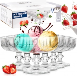 Eleganckie szklane pucharki do lodów o pojemności 270 ml w praktycznym zestawie 6 szt. Wykonane z wytrzymałego, przezroczystego, ryflowanego szkła ze stabilną nóżką dla bezpiecznego serwowania. Idealne na lody, sorbety, jogurty, tiramisu i sałatki owocowe, odpowiednie także na finger food. Można myć w zmywarce dla łatwej pielęgnacji.
