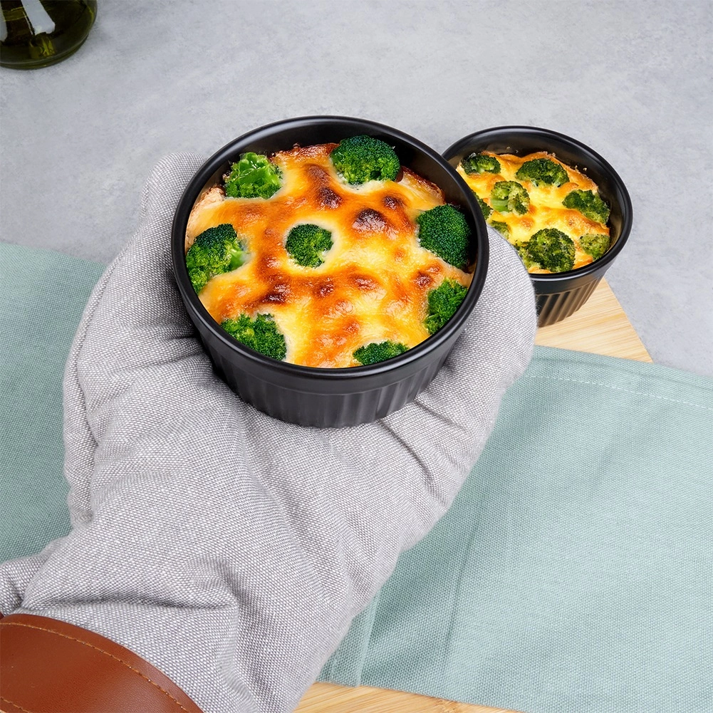 Wszechstronne czarne kokilki to niezastąpiony pomocnik do codziennego gotowania i odświętnego serwowania. Dzięki wysokiej jakości porcelanowemu szkliwu są odporne na temperaturę do 350 °C i nadają się do piekarnika, kuchenki mikrofalowej oraz zmywarki. Matowy, żebrowany design i kompaktowe wymiary 10 × 5 cm dodają Twojemu stołowi stylu.