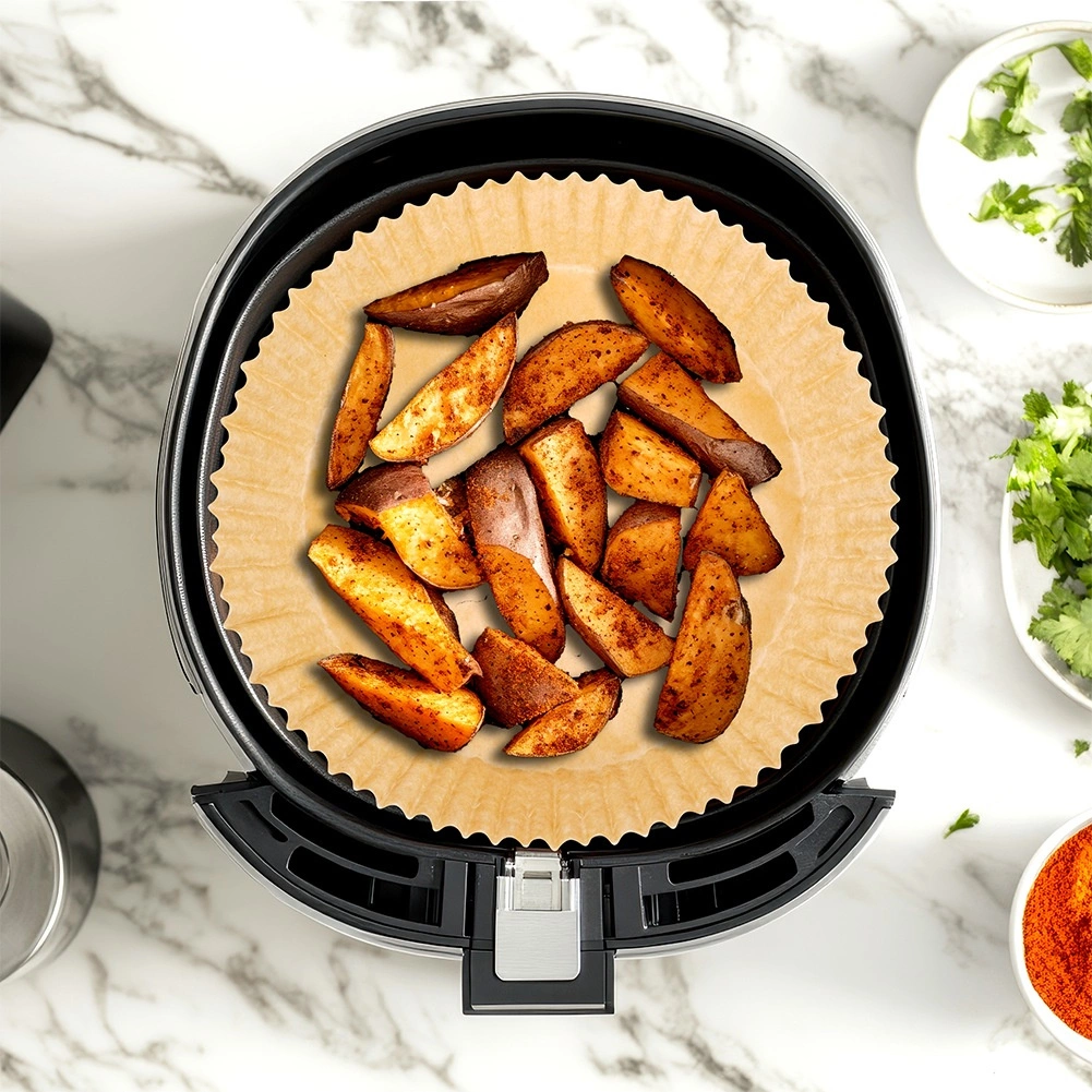Praktyczne papierowe wkładki do frytkownicy beztłuszczowej (VILDE) oszczędzają czas podczas sprzątania i chronią kosz przed zabrudzeniami. Okrągły kształt z wyższymi, fałdowanymi brzegami zapobiega wyciekaniu tłuszczu i okruszków oraz ułatwia serwowanie. Materiał jest bezpieczny w kontakcie z żywnością i nie wpływa na smak potraw.
