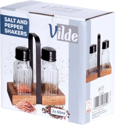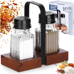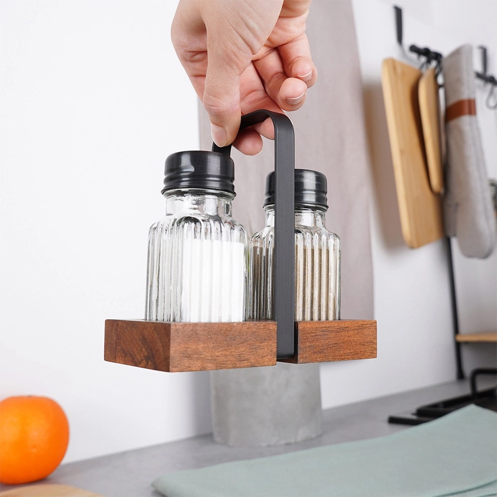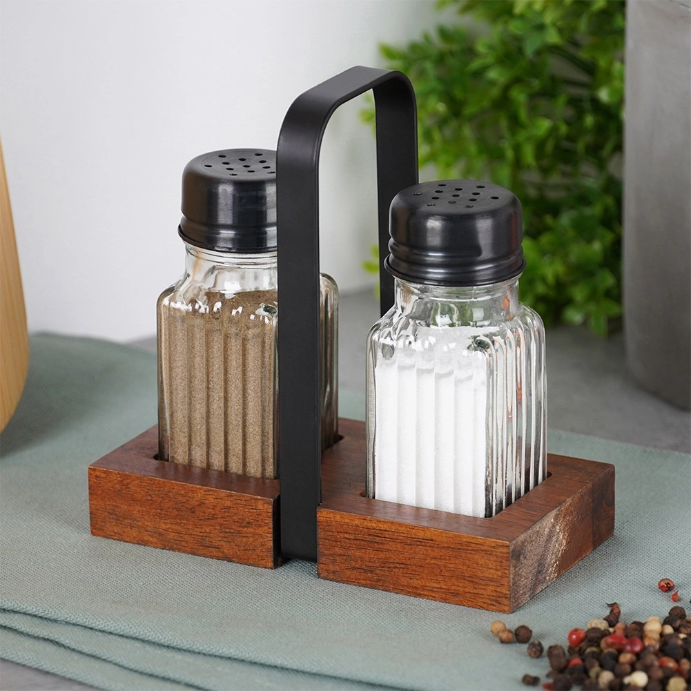 Elegancki zestaw solniczki i pieprzniczki w stojaku z drewna akacjowego z metalowym uchwytem. Żebrowane szklane przyprawniki z czarnymi, zakręcanymi wieczkami oferują wygodne dozowanie, łatwe przenoszenie i stylową organizację na blacie kuchennym i na stole.
