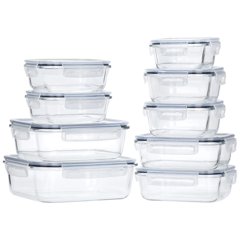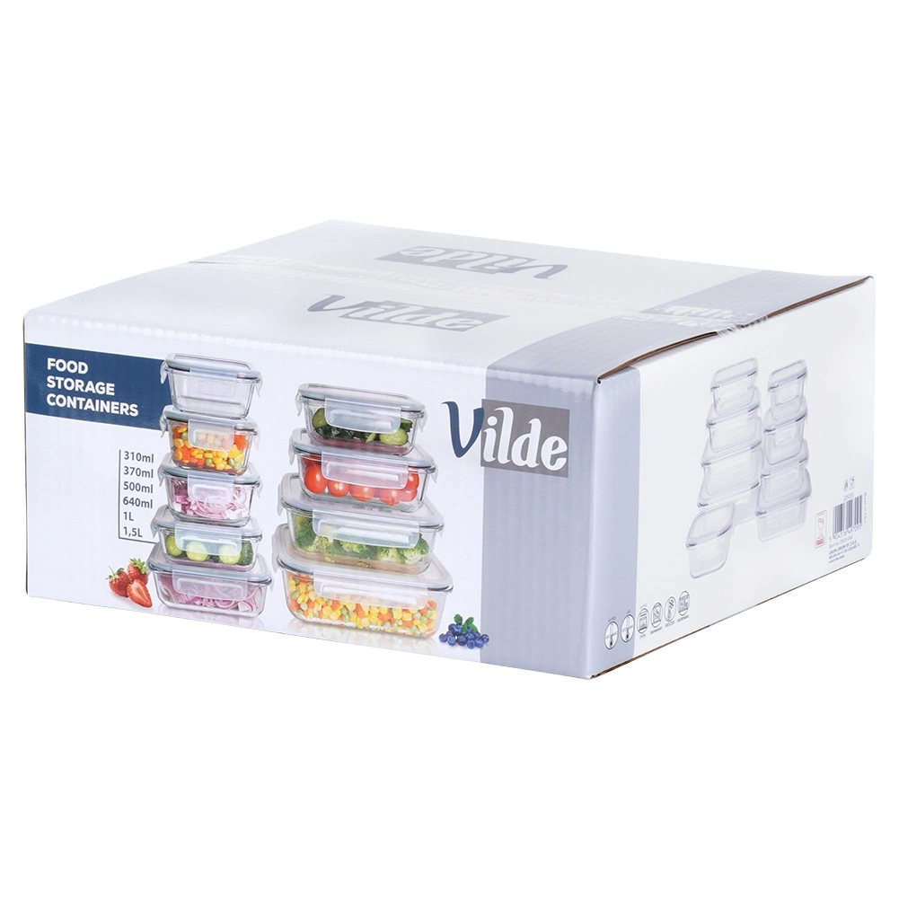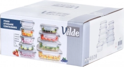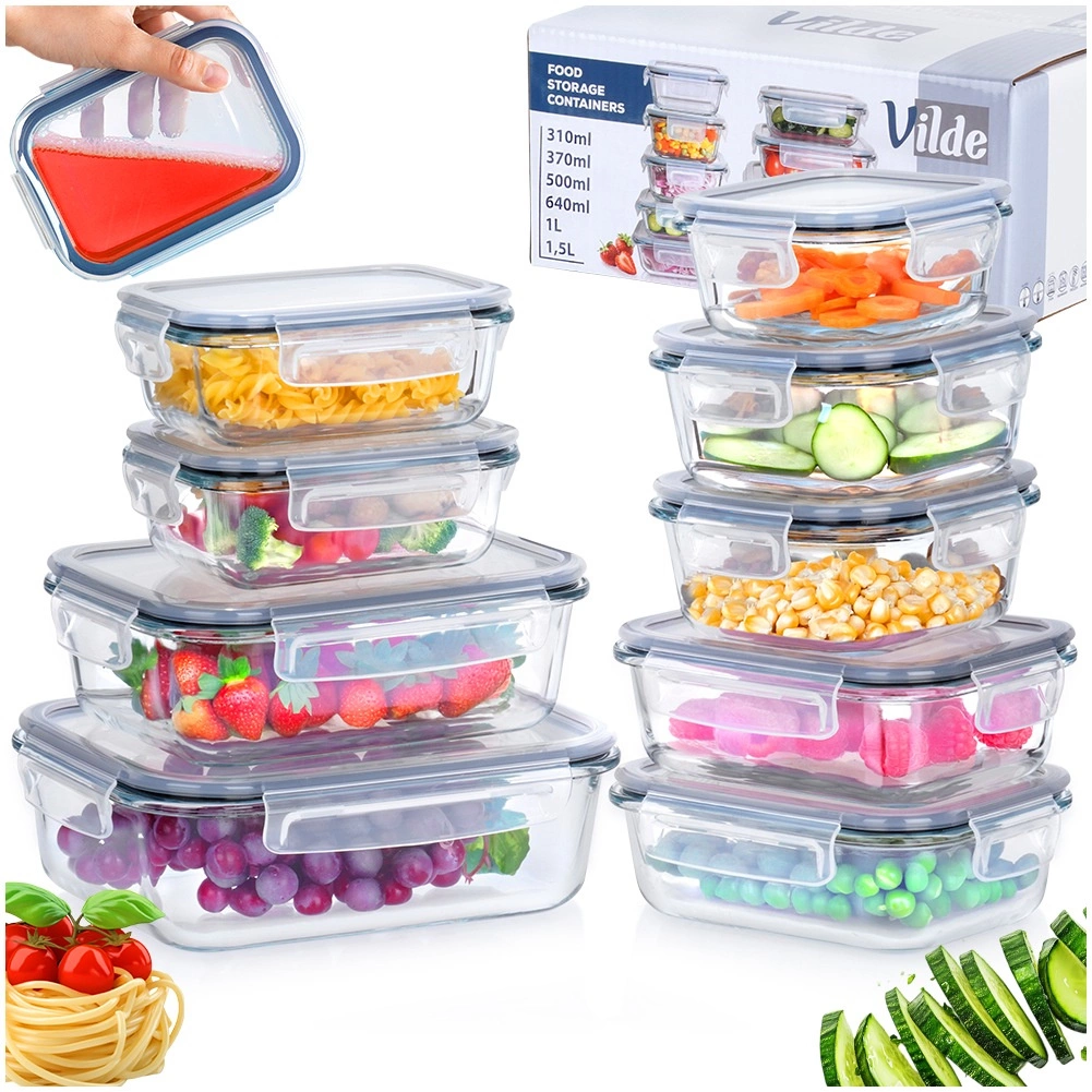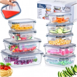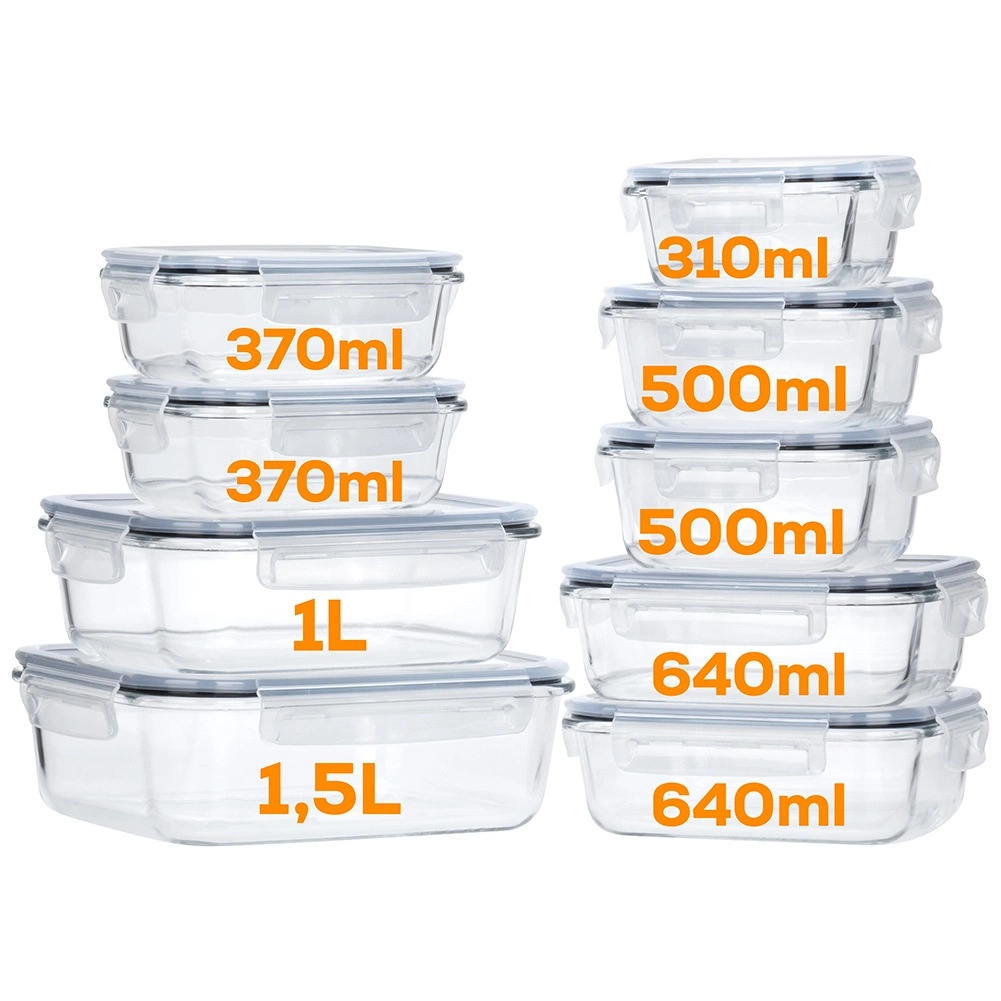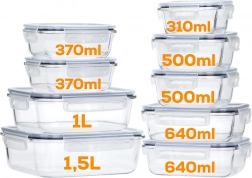 Zestaw zawiera sześć prostokątnych i trzy kwadratowe pojemniki w różnych rozmiarach, które można wkładać jeden w drugi, oszczędzając miejsce. Przezroczyste szkło pozwala szybko sprawdzić zawartość bez otwierania, a solidne pokrywki z czterema klipsami i silikonową uszczelką gwarantują szczelne i higieniczne przechowywanie.