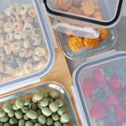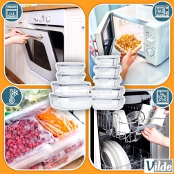 Pojemniki wykonano z szkła borokrzemowego odpornego na wysokie i niskie temperatury. Szkło nadaje się do piekarnika (bez pokrywki), kuchenki mikrofalowej (bez pokrywki), zmywarki oraz zamrażarki. Idealne do przechowywania produktów sypkich, gotowych dań, sałatek, owoców, warzyw i przekąsek – świetne również do meal prepu i przenoszenia lunchów.