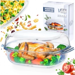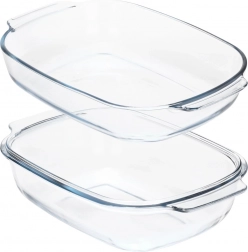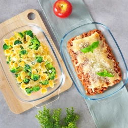 Ten dwuczęściowy zestaw tworzą dwie prostokątne żaroodporne misy, których można używać oddzielnie lub połączyć – jedna część pełni wtedy funkcję praktycznej pokrywy utrzymującej wilgotność i soczystość potraw. Dzięki wytrzymałemu szkłu borokrzemowemu znosi temperatury od -30 °C do +400 °C i idealnie nadaje się do zapiekania mięsa, lasagne, ziemniaków, warzyw oraz słodkich zapiekanek.