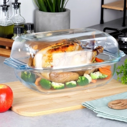Zintegrowane rączki ułatwiają przenoszenie, a przezroczyste szkło pozwala śledzić przebieg pieczenia bez zbędnego zdejmowania pokrywy.